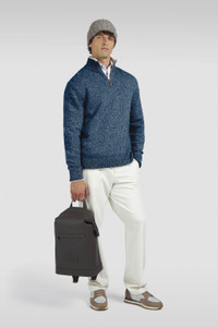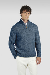 Luxurious materials, refined silhouettes and meticulous attention to detail: the ultimate embodiment of Paul & Shark's effortless elegance. Paul & Shark revisits a menswear classic with fine yarn and modern proportions. This high-neck jumper is knitted from a luxurious blend of wool and cashmere, which come together to create a refined melange effect. The ribbed trims are detailed with an elegant contrast edge, while the half-zip closure makes it perfect for throwing over collared shirts for effortlessly refined layered looks. DETAILS Shark label Zip closure Wool and cashmere half-zip sweater fineness 5 Ribbed collar, cuffs and flounce Stocking stitch Long sleeve Regular Fit Product ID: 15311112 COMPOSITION & CARE Composition: Outside: 70% virgin wool 30% silk