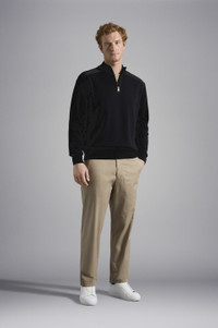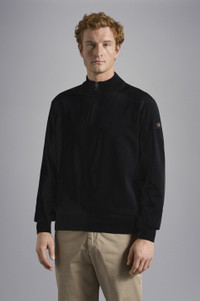 DETAILS High neck with zip Technical fabric inserts Wool half zip sweater with iconic badge Long sleeves Regular fit Product ID: C0P1028 COMPOSITION & CARE Composition: 50% Wool 50% Acrylic