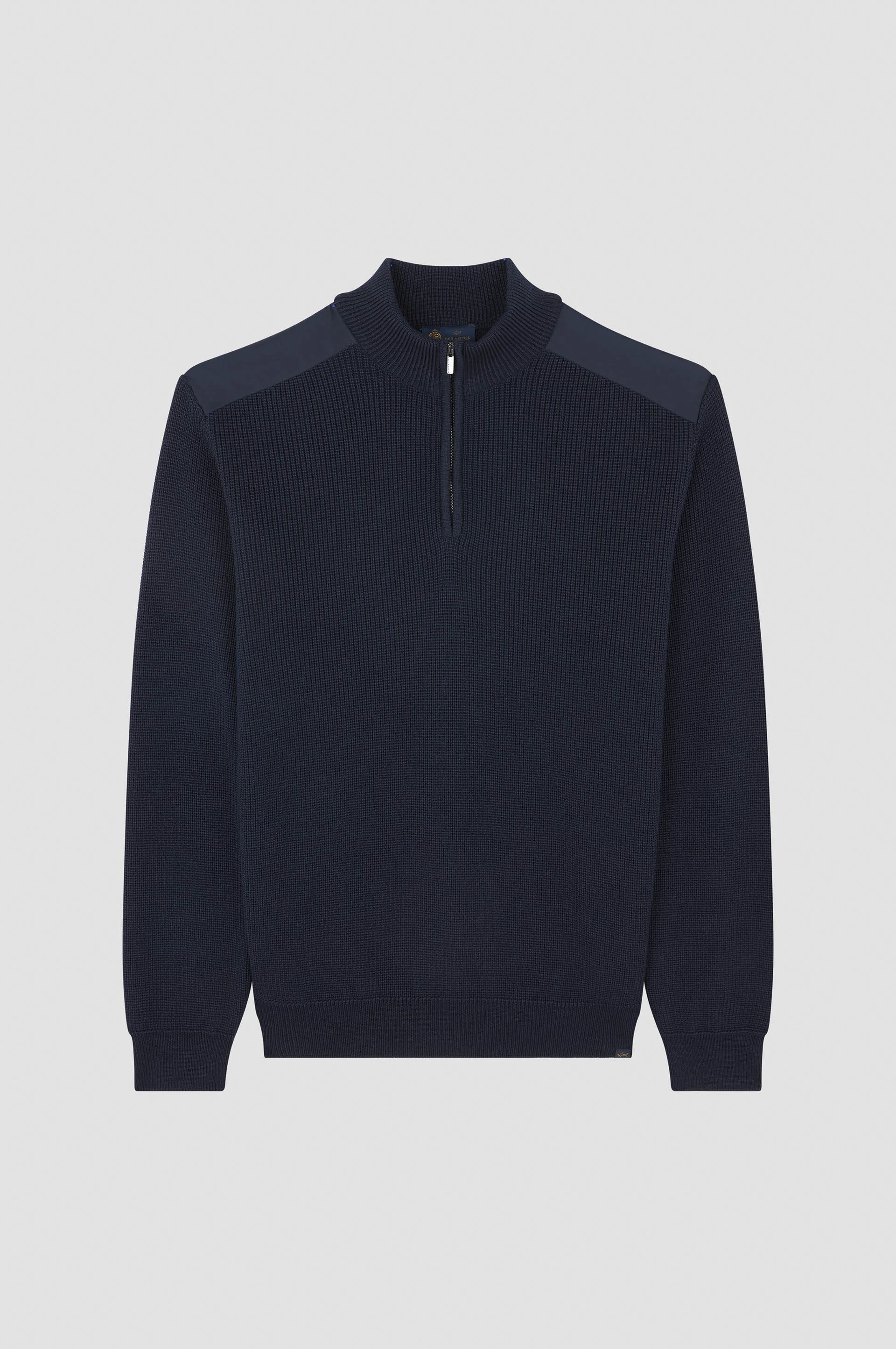 Dedicated to the daring, Typhoon Silk is a luxurious high-performance silk designed to take on every adventure with elegance and style. Superior functionality, an appreciation for premium fabrics and a clean, streamlined aesthetic with modern elegance. This half-zip jumper is made from a refined blend of wool and silk with a luxuriously tactile ribbed knit. Inspired by classic sailing apparel, it’s elevated with reinforced shoulders in Typhoon Silk: a sophisticated silk fabric with a special coating that makes the surface both waterproof and windproof. DETAILS Shark label Zip closure Wool and silk half-zip sweater fineness 8 with Typhoon® Silk details Ribbed collar, cuffs and flounce English rib knit Long sleeve Regular Fit Product ID: 15311173 COMPOSITION & CARE Composition: Outside: 70% virgin wool 30% silk