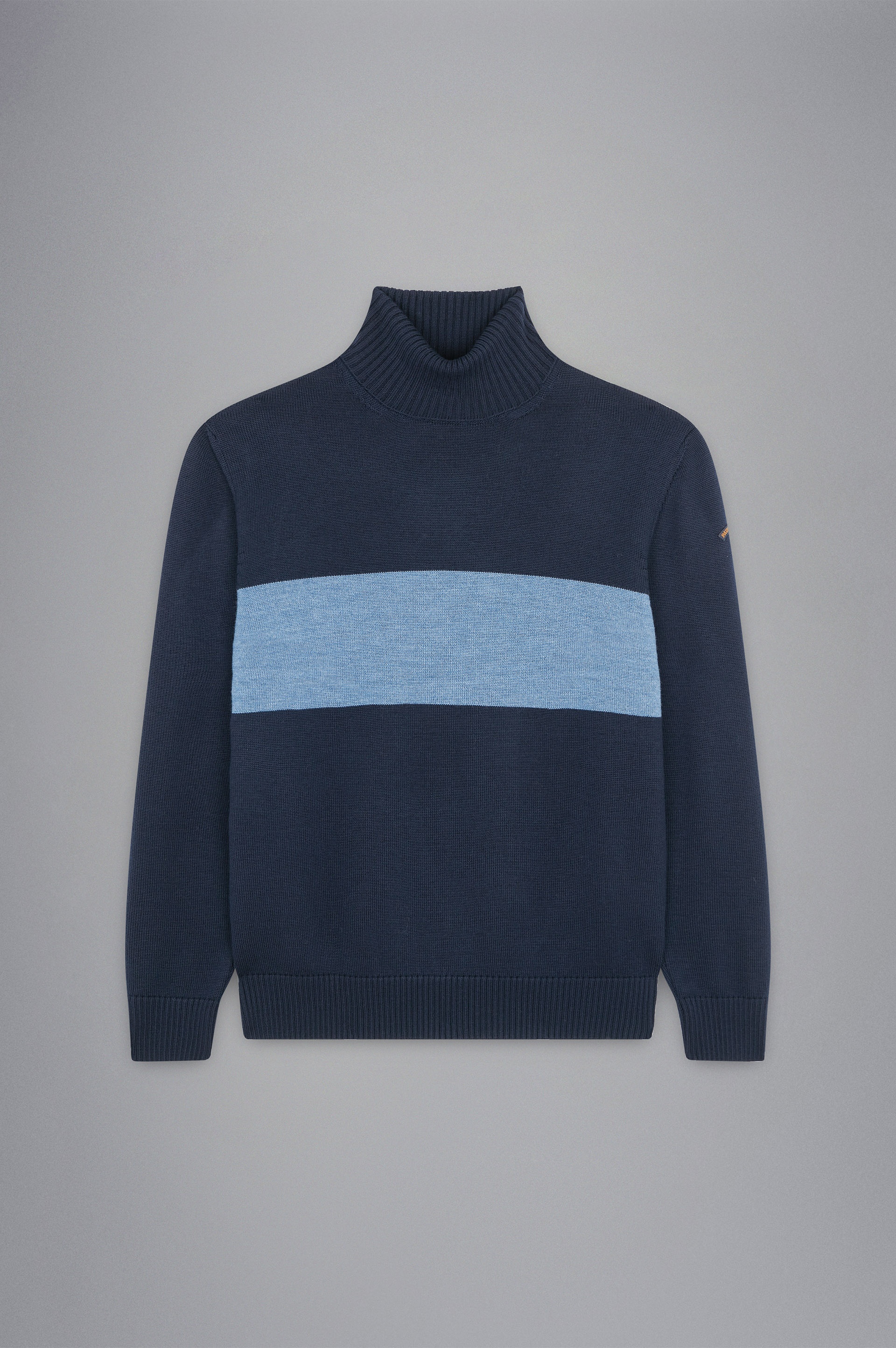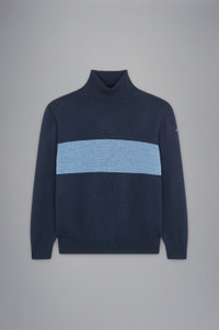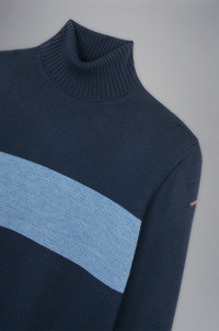 DETAILS Moon badge Turtleneck sweater in gauge 8 wool with maxi stripe inlay Ribbed collar, cuffs and flounce Jersey knit Product ID: 14311063 COMPOSITION & CARE Composition: 100% Virgin Wool