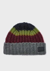 Made in Great Britain from a mohair and wool blend this beanie has a subdued stripe colourblock design. The chunky knit design is complete with signature Paul Smith logo label branding and finished with a folded brim. 50% Lambswool, 29.5% Mohair, 20.5% Wool Made in Great Britain Product Code: M1A-383MK-N263-79