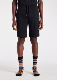 Men's loose fitting black 100% jersey cotton lounge shorts with a tonal drawstring, on-seam pockets with 'Artist Stripe' trim and elasticated waistband. Designed for a comfortable fit, this loungewear essential will seamlessly elevate your everyday wardrobe. Decorative button-down fly Flatlock stitching used throughout Knitted, 100% Cotton Machine washable The Fit Regular Fit is relaxed through the body. Product Code: M1A-374K-AU279-79