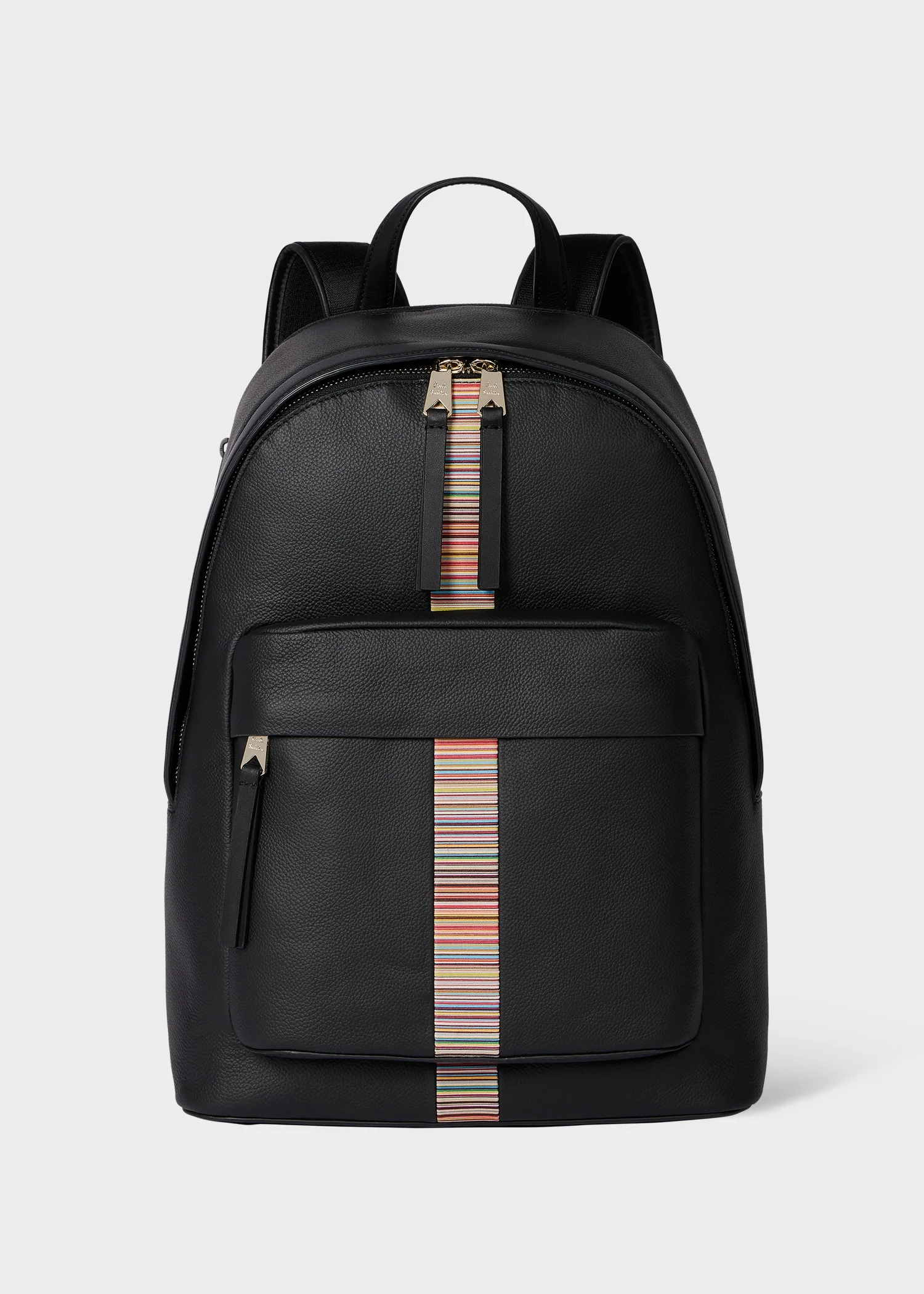 Made from premium grained leather, this black backpack features our timeless 'Signature Stripe' trim down the centre. Complete with a two-way zip opening and front zip pocket for practicality, this bag is finished with adjustable shoulder straps and a mesh back panel with slip that allows you to put the bag over your suitcase handles for ease of transportation. * Central 'Signature Stripe' detail * Adjustable shoulder straps * Rear mesh panel * Slip detail for suitcase handles * Fully lined main compartment * Internal zip pocket * Size: H41 x W28 x D14cm * 100% Leather Product Code: M1A-8037-CMULTI-79