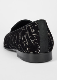 Made in Italy from premium velvet uppers, these black 'Rudyard' loafers feature our monochrome seasonal 'Notebook Writing' print. Complete with tonal grosgrain trims and leather soles. These loafers will elevate your formal attire, adding a unique touch. Product Code: M1S-RUD07-TVEL-79