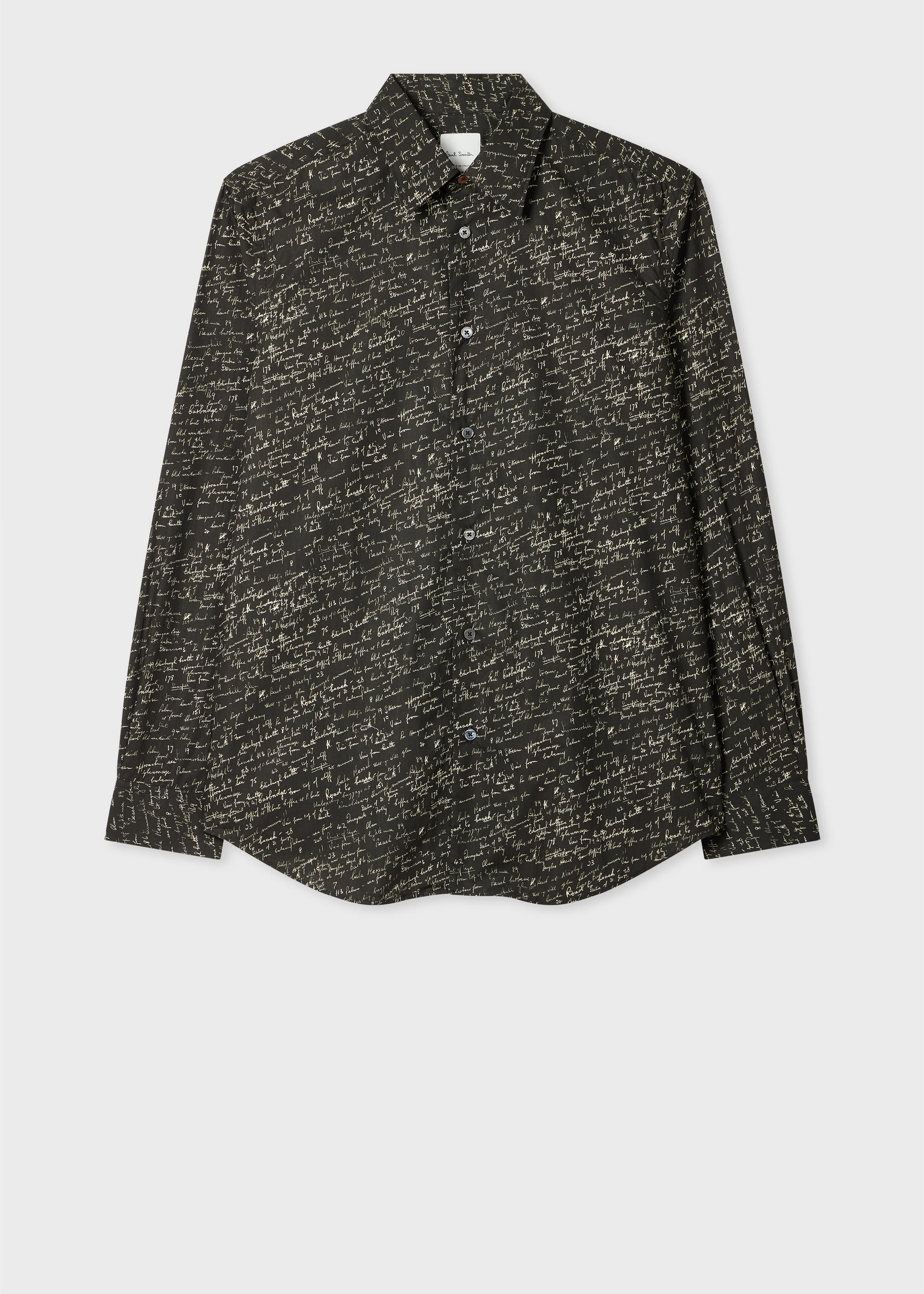 Crafted in Italy from 100% cotton for a lightweight finish, this black shirt features a 'Slide Notes' all-over print. Cut for a tailored-fit with a soft point collar, this shirt is ideal for adding a point of difference under a tailored jacket. The Fit - Relaxed through the chest - Slimmer through the waist Product Code: M1R-598Z-T02796-79