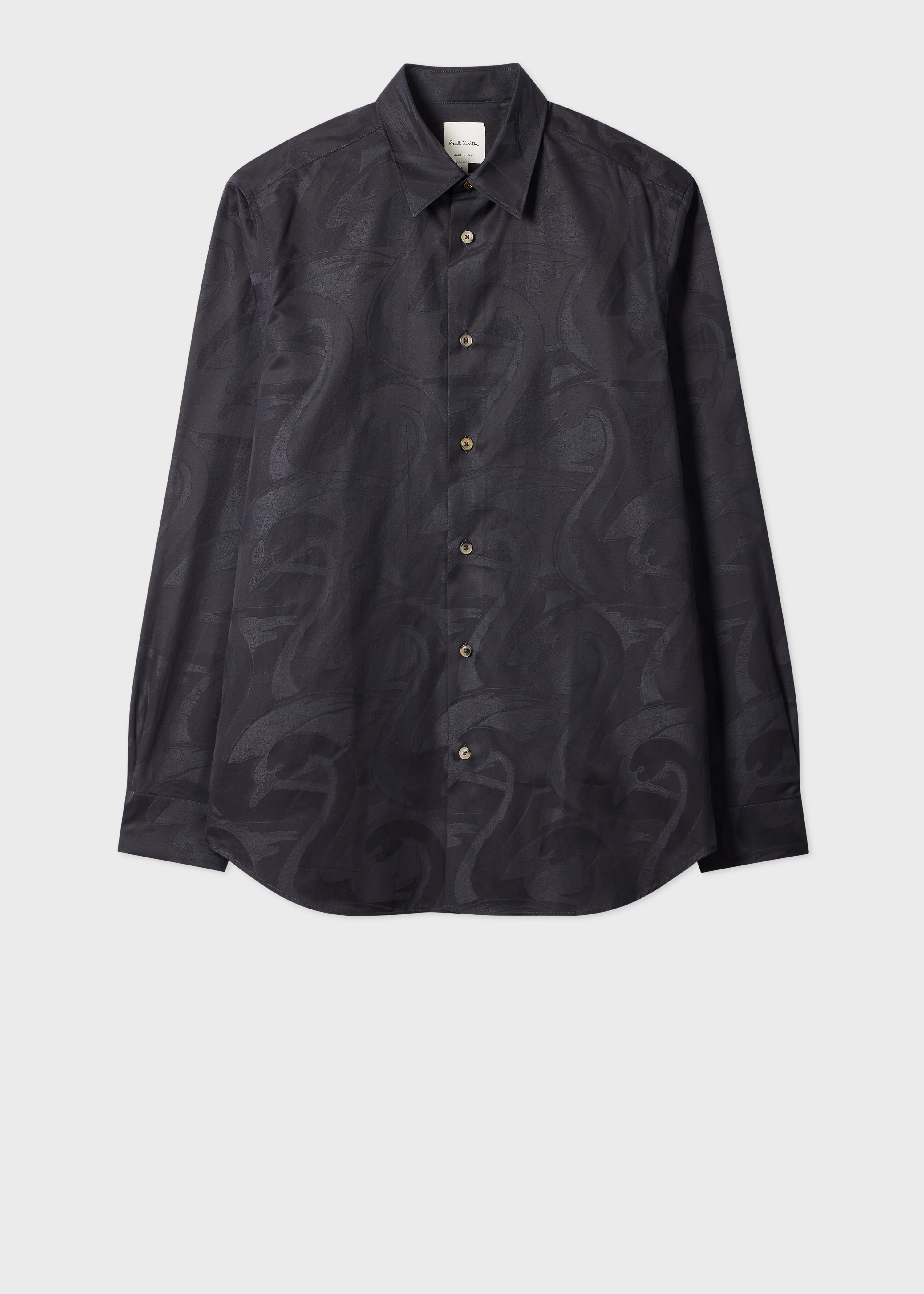 Crafted in Italy from 100% cotton, this black shirt features a tonal jacquard 'Swan' pattern. Cut for a regular-fit for everyday comfort, this shirt is finished with natural buttons and a contrast gold coloured top button - for an added twist. The Fit - Regular-Fit is relaxed through the body. Product Code: M1R-901U-V02922-79