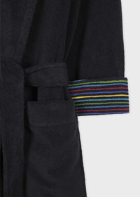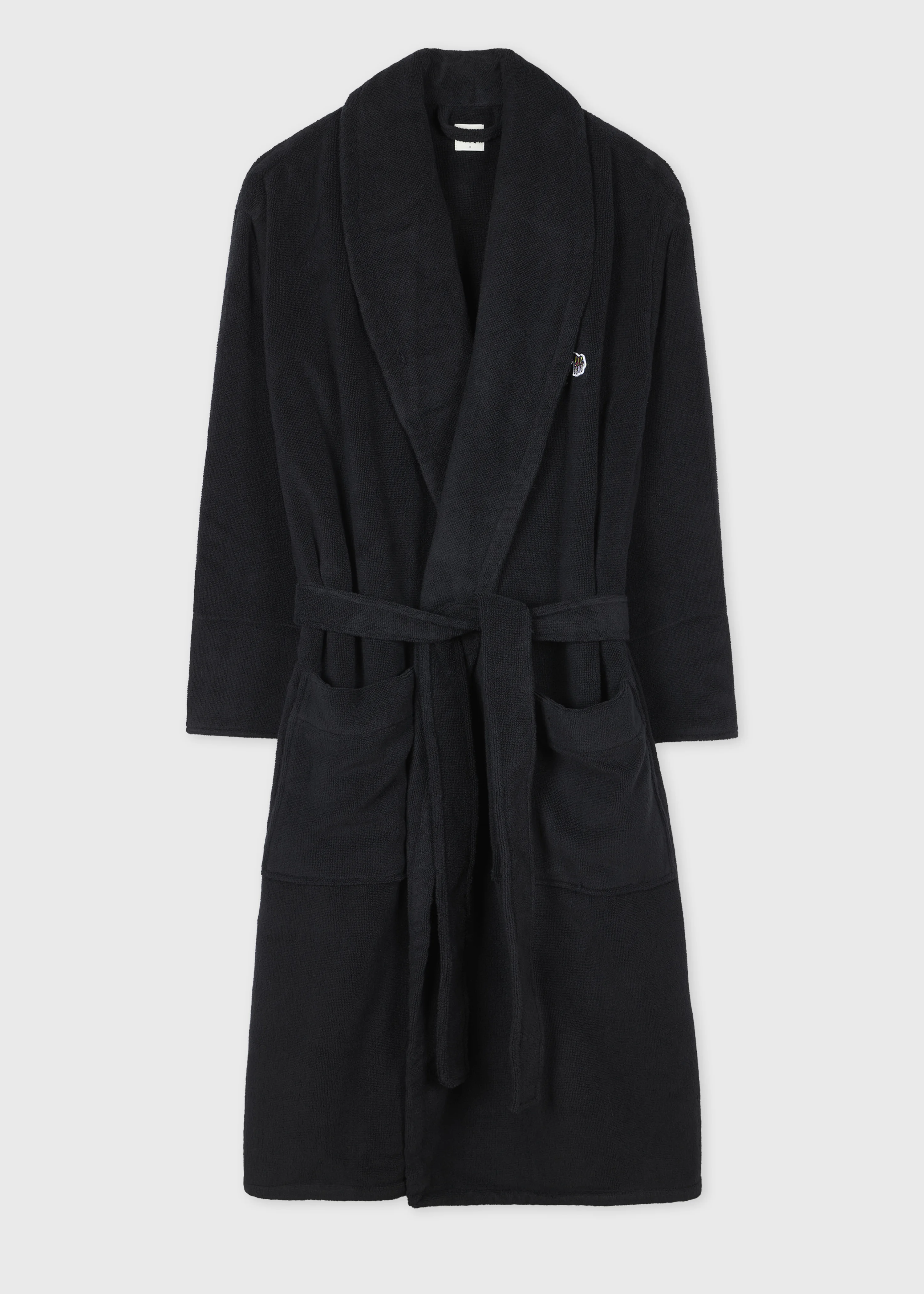 Made from soft 100% cotton towelling fabric, this black dressing gown features our signature zebra logo. Designed for comfort and relaxation, the dressing gown is perfect for lounging at home. Complete with a tie belt and two front pockets for practicality. The Size Model wears a size M Model measures: Height 6.1 ” / 185cm | Chest 38’ / 96 cm | Waist 31.5”/ 80cm The Fit - Regular-Fit Product Code: M1A-681-PUZEB-79