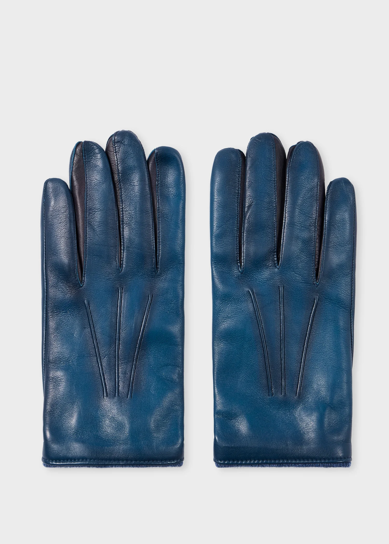 Crafted in Italy from premium leather for a soft finish, these blue gloves feature a tonal wool, cashmere and silk-blend lining for added warmth. Complete with a subtle spray pattern which uses produces a two-tone effect across the gloves. Product Code: M1A-415GL-T733-47