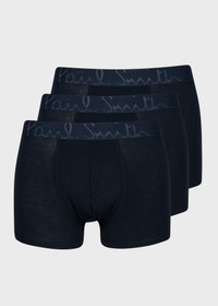 This three pack of navy boxer shorts, made from a soft and breathable modal, feature a large tonal Paul Smith signature on the elasticated waistband. 95% Modal, 5% Elastane Machine washable Product Code: M1A-916FH-M3PK53-47