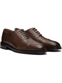Polished calfskin derbys. · Lace-up closure · Logo flag at heel collar · Buffed leather lining · Stacked leather heel with rubber injection · Treaded leather sole Supplier color: Brown Upper: calfskin. Sole: leather. Made in India 252260M225004