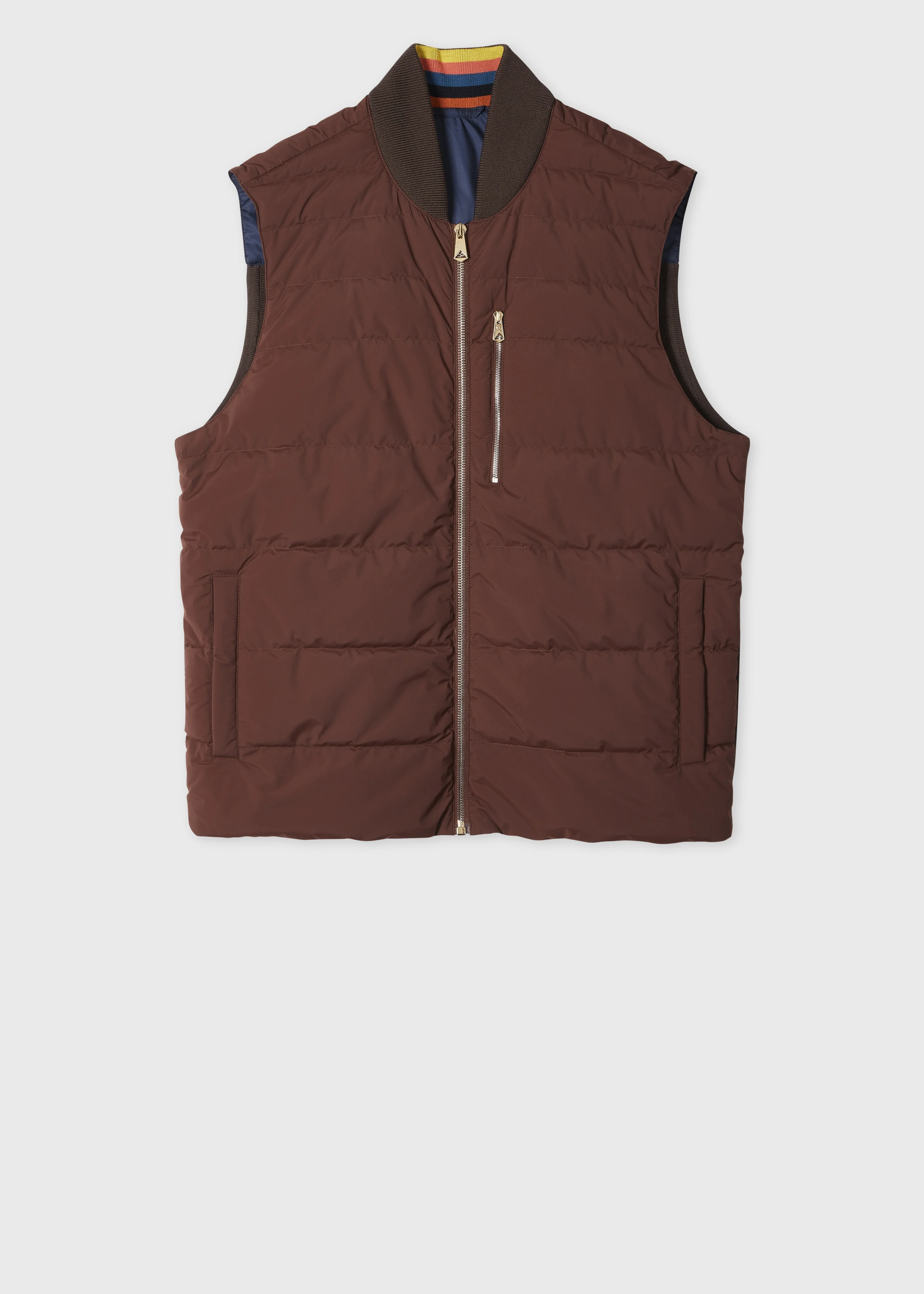 The perfect companion for the transitional season, this brown hybrid gilet features a mixed-media construction for elevated styling. The front panel is filled with down for warmth, while the back panel is made from a knit cotton construction for a breathable feel. The gilet is complete with a ribbed neckline, zip fastening with tie-shaped zip pulls, and interior pockets for added storage. A chest pocket adds functionality, while the interior neckline and back are detailed with 'Artist Stripe' accents for a distinctive touch. The Fit - Regular-Fit is relaxed through the body. Product Code: M1R-402Z-P01501-26