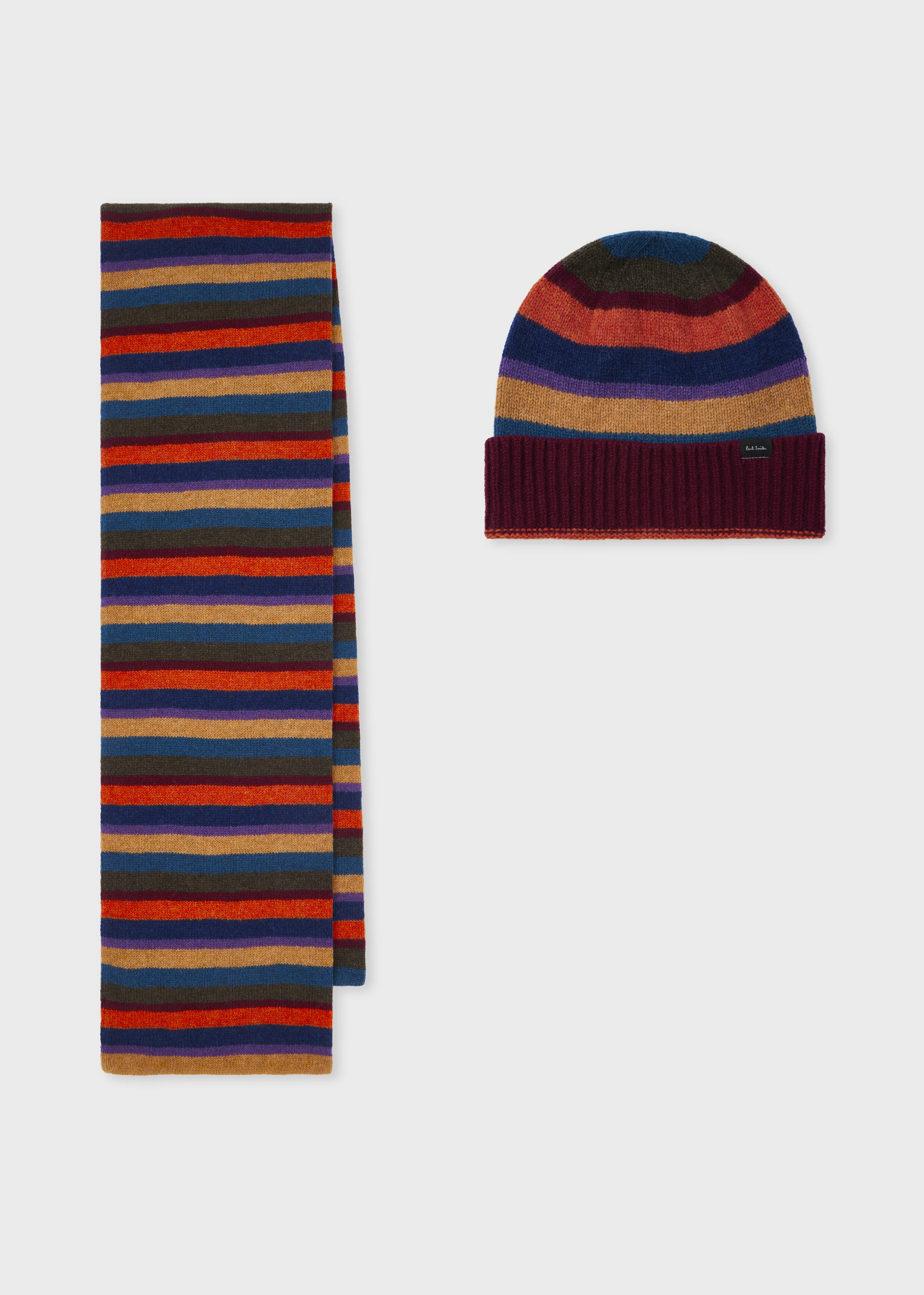 Crafted in Britain from a luxurious lambswool construction, this beanie and scarf set features a burgundy base decorated with a 'Seasonal Stripe' design. The hat features a 'Paul Smith' signature tab label and is finished with a folded brim. Product Code: M1A-ECOMM-TGIFT-28