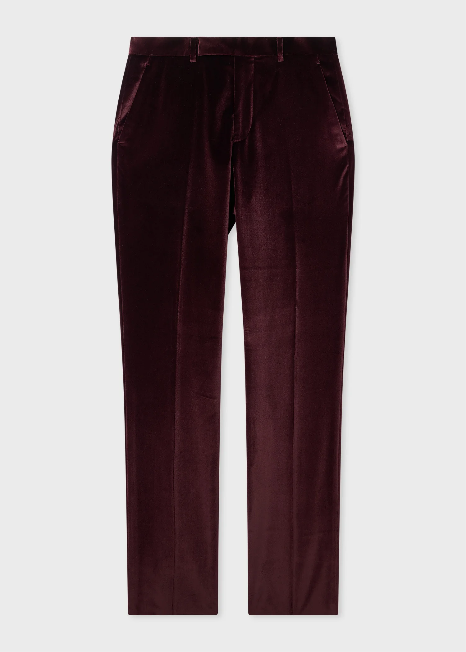 Made in Portugal from a premium velvet cloth which is woven from very fine cotton yarns to result in a compact, fluid and silky finish - these burgundy trousers are cut for a tapered-fit. Complete with dual hook-and-eye closure, these trousers are finished with a zip fly. The Fit - Tapered with a narrow hem Product Code: M1R-925N-M01346-28A