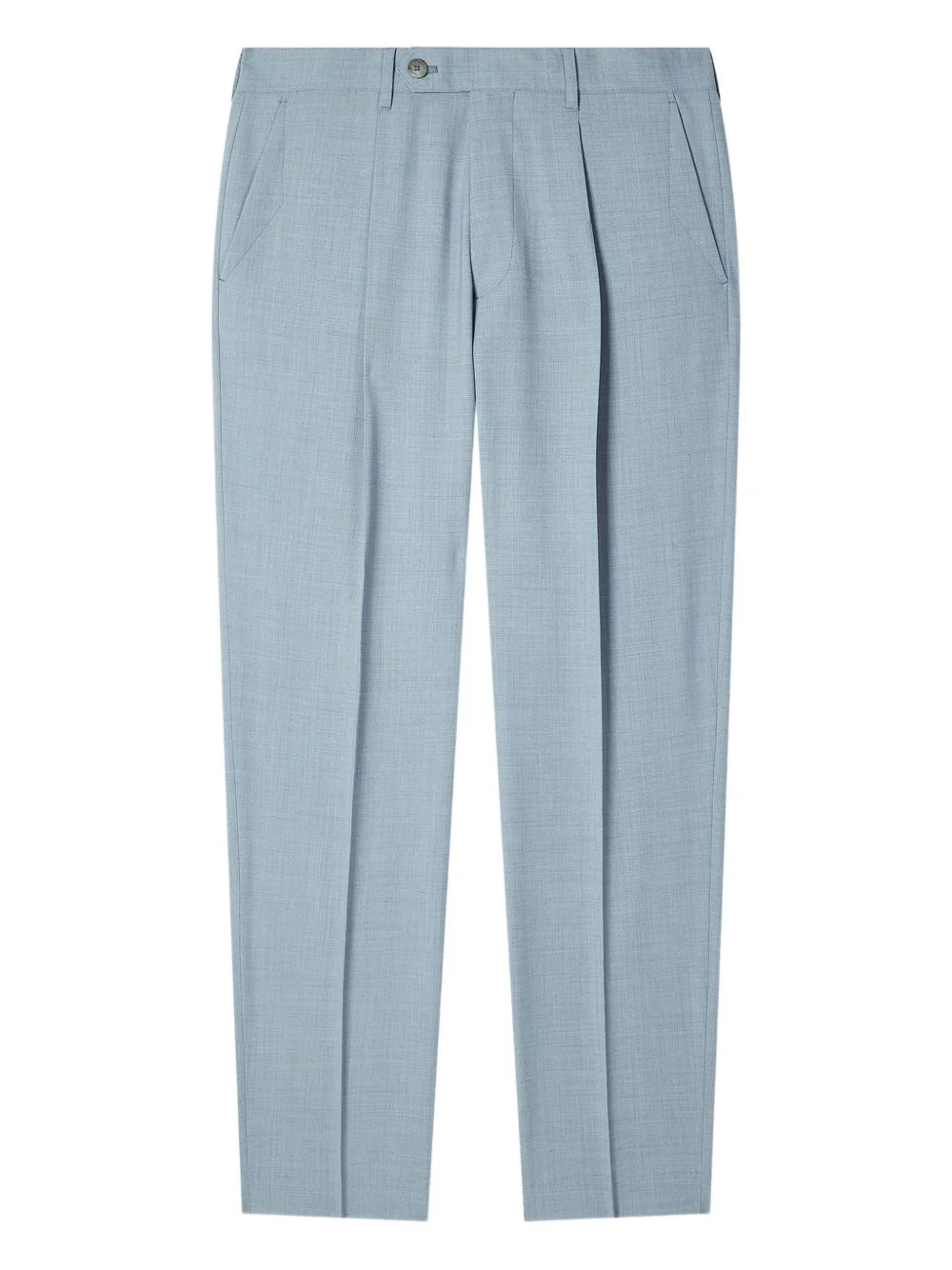 button-fastening pleated pocket trousers Highlights - Light blue - Wool blend - Button fastening - Front pleats - Rear button-fastening pocket - Belt loops Imported Composition Wool 97%, Elastane 3% Washing instructions Read Manufacturer Guidelines