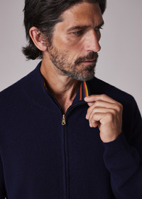 Made in Italy, using premium cashmere that is spun in the UK by Todd & Duncan at their Loch Leven Mill in Scotland, this navy cardigan features a full zip closure with a funnel neck. Finished with a tie-shape zip pull and 'Artist Stripe' trims for a signature flash of colour. 100% Cashmere Hand wash Made in Italy [i]For more than 150 years, Todd & Duncan have been creating the most excellent cashmere yarns available, from their mill on the shore of Loch Leven, Scotland. We use these yarns for our cashmere knitwear, ensuring exceptional softness, comfort, and durability. [/i] The Fit Regular-Fit is relaxed through the body. Product Code: M1R-906Y-N02497-49