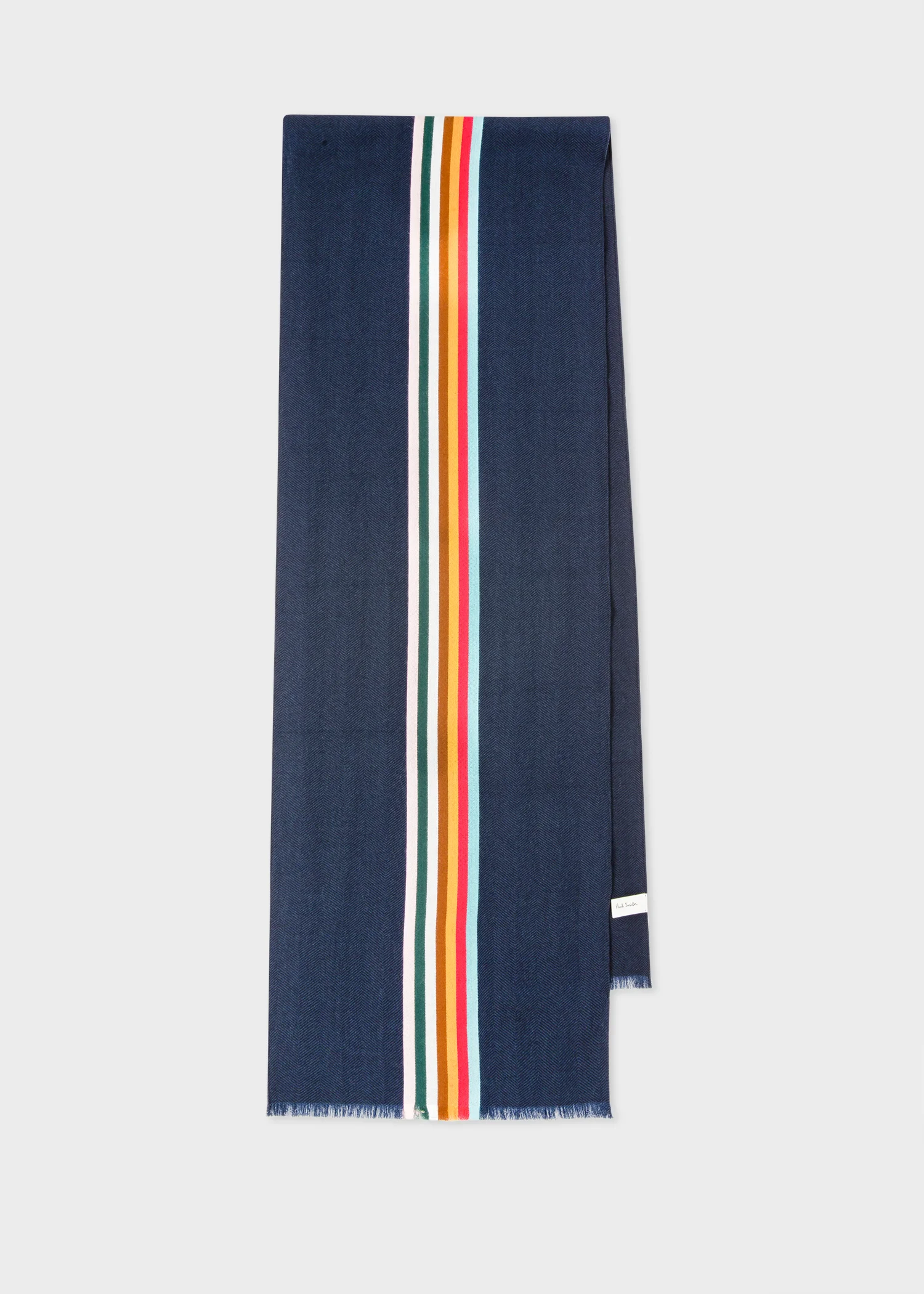 Made from a virgin wool-blend, this dark blue, lightweight, herringbone scarf features a woven multi-stripe design, incorporating our timeless Paul Smith signature into this transitional piece. Size: 180cm x 30cm 82% Virgin Wool, 18% Viscose Dry Clean Only Product Code: M1A-150C-J324-47
