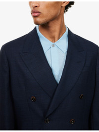 PRODUCT DETAILS - Paul Smith wool-silk blazer - 72% wool, 11% silk, 11% linen, 4% nylon, 2% elastane - Button fastening - Regular fit, double-breasted, peak lapels, padded shoulders, long sleeves, buttoned cuffs, welt pocket at chest, patch pockets at front, double open vent at back, contrast buttons, partially lined - Dry clean only - Size 38: length 29in / 74cm, chest 40in / 102cm - Model is 6ft 2in/1.88m and wears a size UK 38 - Lightweight, non-stretch Ref: R04574040