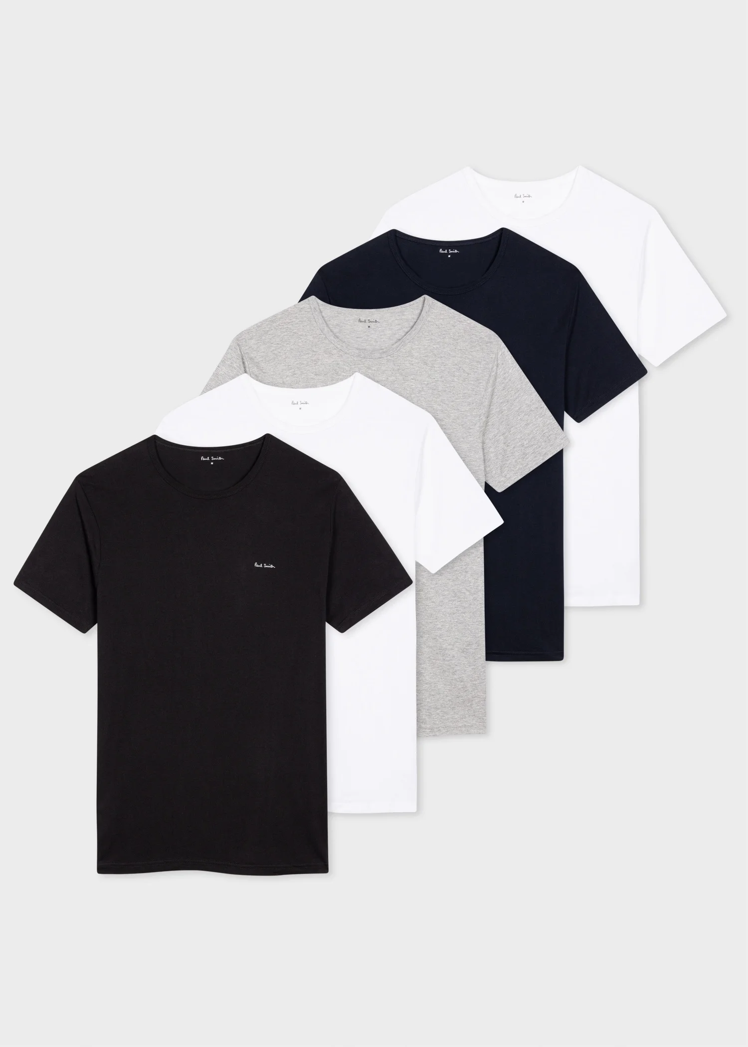 Made from 100% organic cotton, this five pack of mixed colour crew neck T-shirts feature a small Paul Smith logo print on the chest and inside the collar. Designed for a comfortable fit, this loungewear essential will seamlessly elevate your everyday wardrobe. 100% Organic Cotton Machine Washable Product Code: M1A-389-M5PK-1A
