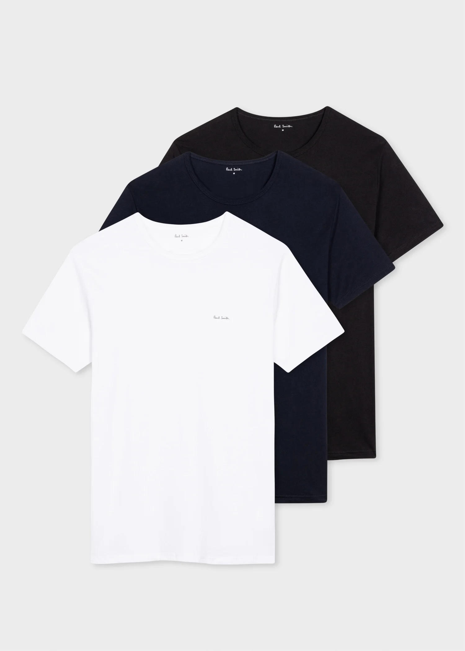 Three pack of white, navy and black crew neck T-shirts made from soft 100% organic cotton. Featuring a small Paul Smith logo print on the chest and inside the collar. Designed for a comfortable fit, this loungewear essential will seamlessly elevate your everyday wardrobe. 100% Cotton Machine washable Product Code: M1A-389-M3PK-2A