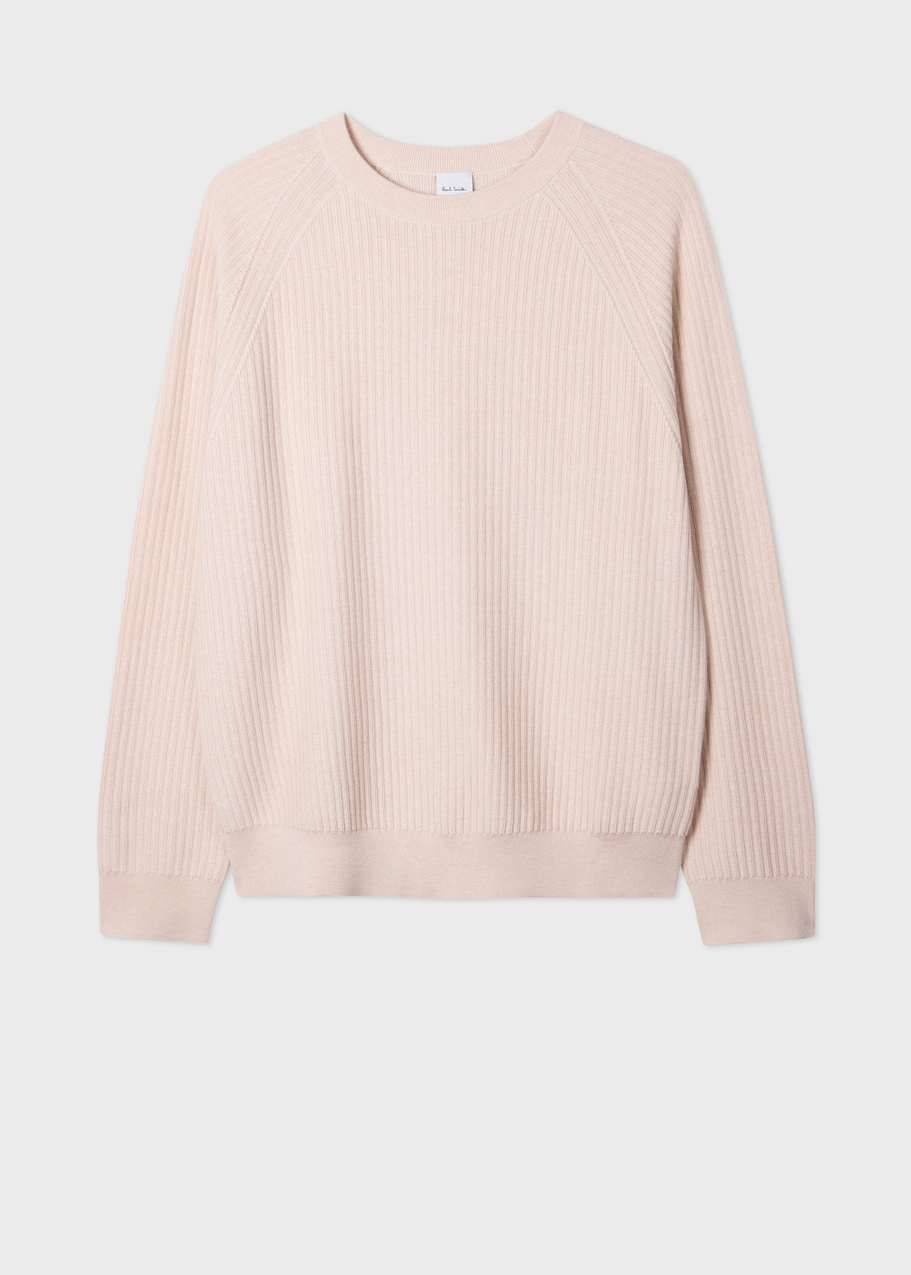 Crafted from a merino wool and cotton blend, this cream crew neck sweater showcases a ribbed construction throughout. Complete with raglan sleeves. tonal stitching and ribbed trims. The sweater is complete with 'Signature Stripe' detailing on the back collar. The Fit - Regular-Fit is relaxed through the body. We recommend sizing up if you prefer a roomier fit. Product Code: M1R-765Z-V02962-06