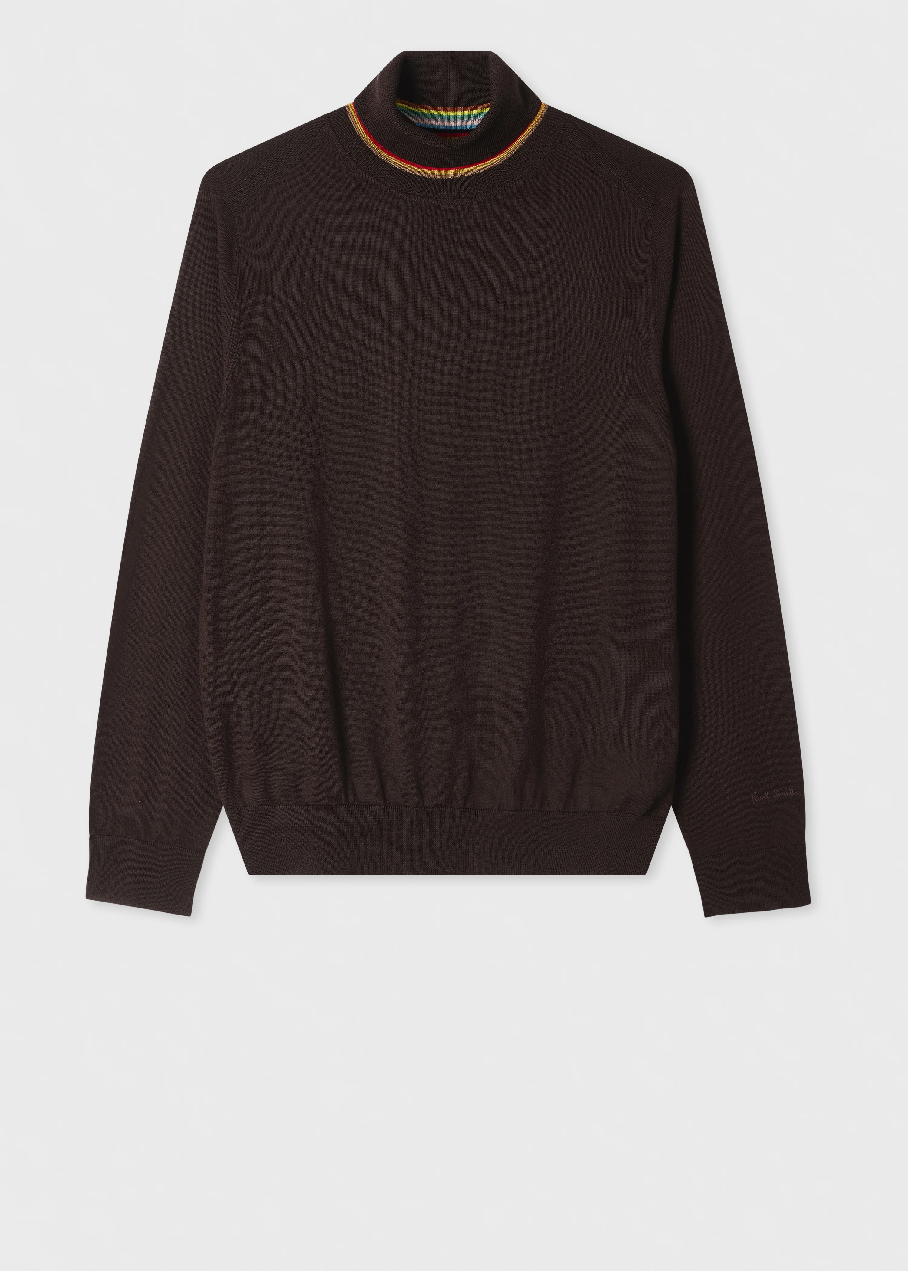Crafted from 100% merino wool for a soft and breathable finish, this dark brown roll neck sweater is a timeless piece. Versatile for both formal and casual occasions, this sweater is finished with our 'Signature Stripe' on the collar for a flash of colour. Product Code: M1R-539Z-T02093-69A