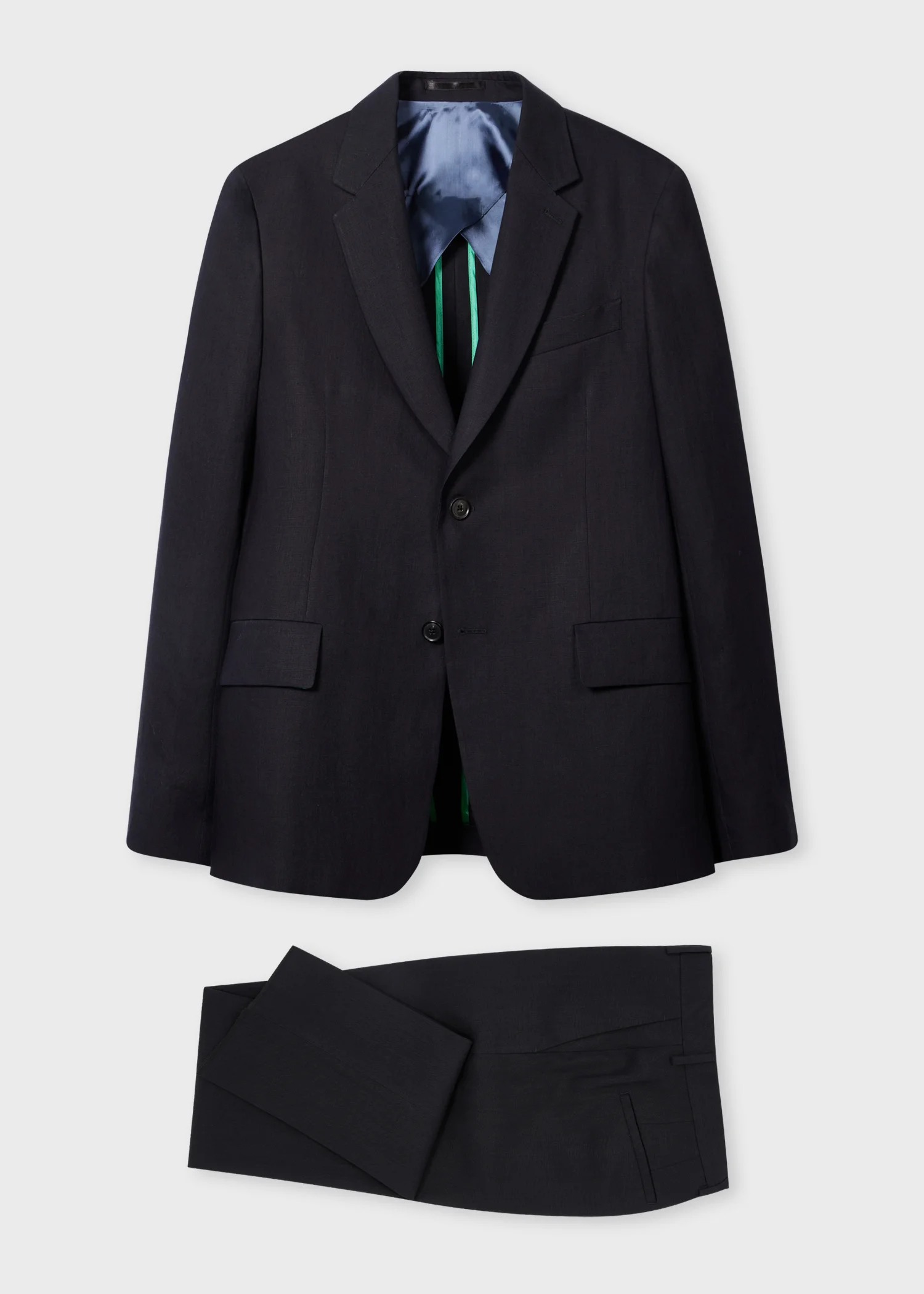 Made in Portugal from 100% linen for a lightweight finish, this dark navy suit features a buggy lining for added comfort and breathability. The blazer has contrast buttons, flap pockets with green lining, and is finished with contrast internal binding. The trousers are a tapered fit with a narrow hem. Complete with hook-and-eye fastening and rear welt pockets. Product Code: M1R-SUIT-R01427-49A