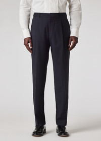 Made in Portugal from a rich wool and mohair blend, these dark navy tailored trousers feature a pleated design. Cut for a tapered-fit, these trousers are an ideal styling piece for formal occasions. 84% Wool, 16% Mohair Dry Clean Only Made in Portugal The Fit Tapered-Fit fits looser through the thigh, with a taper from knee to hem. Product Code: M1R-059Z-N00002-49