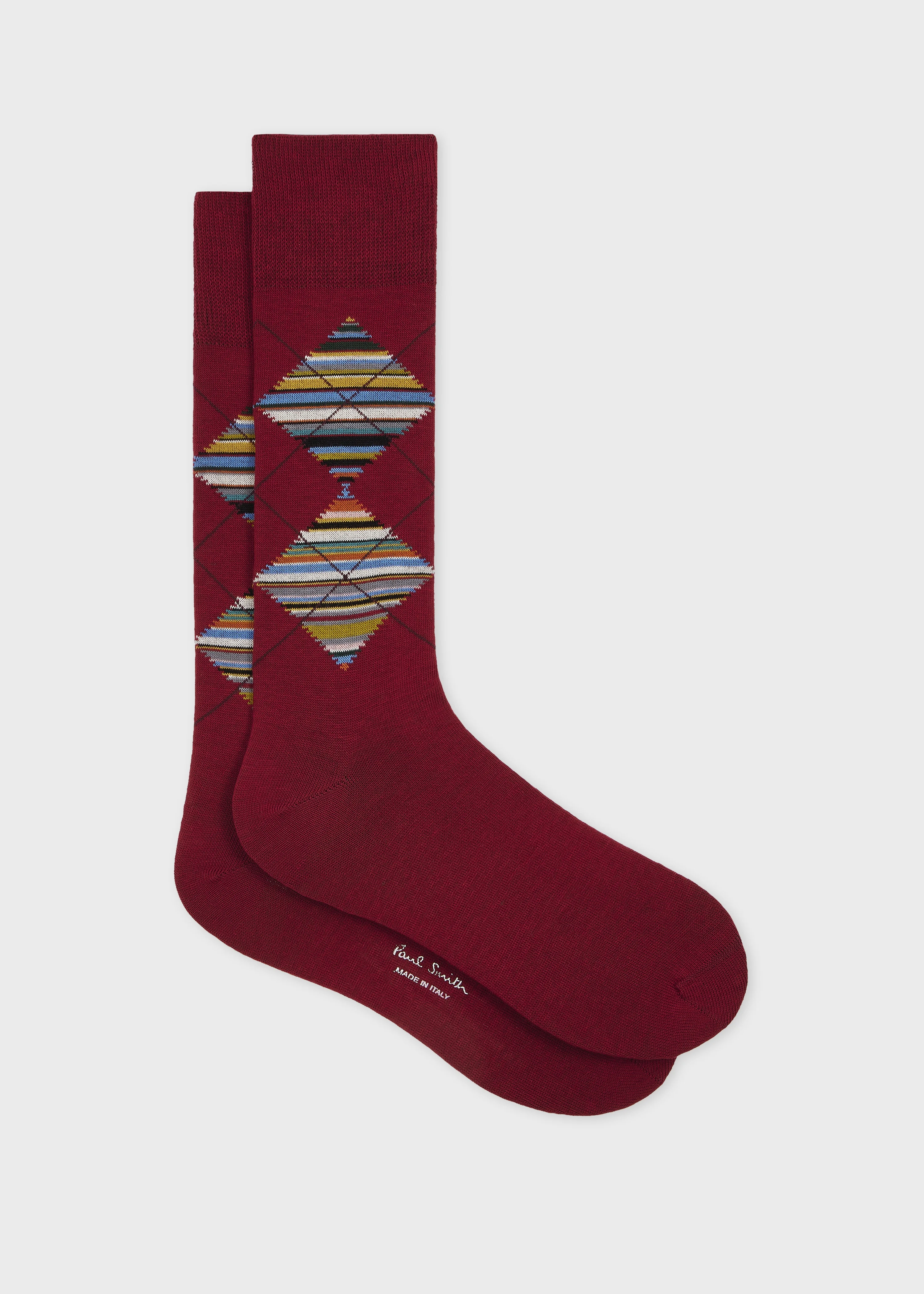 Made in Italy from a soft cotton-blend for comfort, these dark red socks feature a classic Argyle pattern with our 'Signature Stripe' providing a flash of colour. 84% Cotton, 15% Polyamide, 1% Elastane Machine washable Made in Italy Product Code: M1A-380CI-T577-28