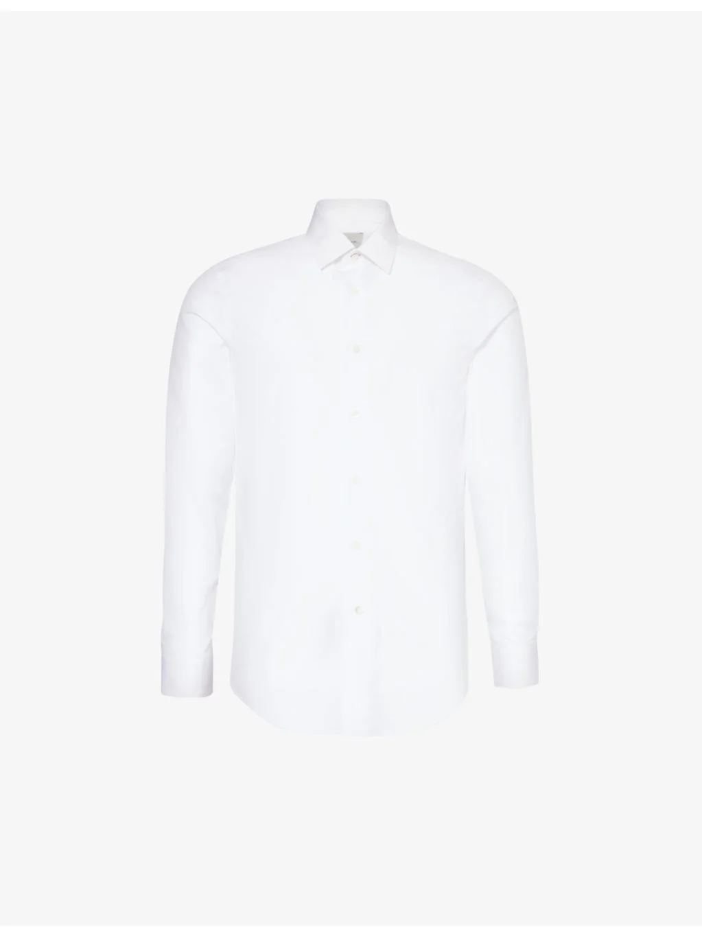 PRODUCT DETAILS - Paul Smith cotton shirt - 100% cotton - Exposed button fastenings at front - Straight-point collar - Buttoned cuffs - Slim fit, long sleeves, darts at back, curved hem - Machine wash cold - Made in Italy - Collar size 15: length 31in / 79cm, chest 40in / 102cm - Model is 6ft 2in / 1.88m and wears a collar size 15 - Midweight, non-stretch Ref: R04315564