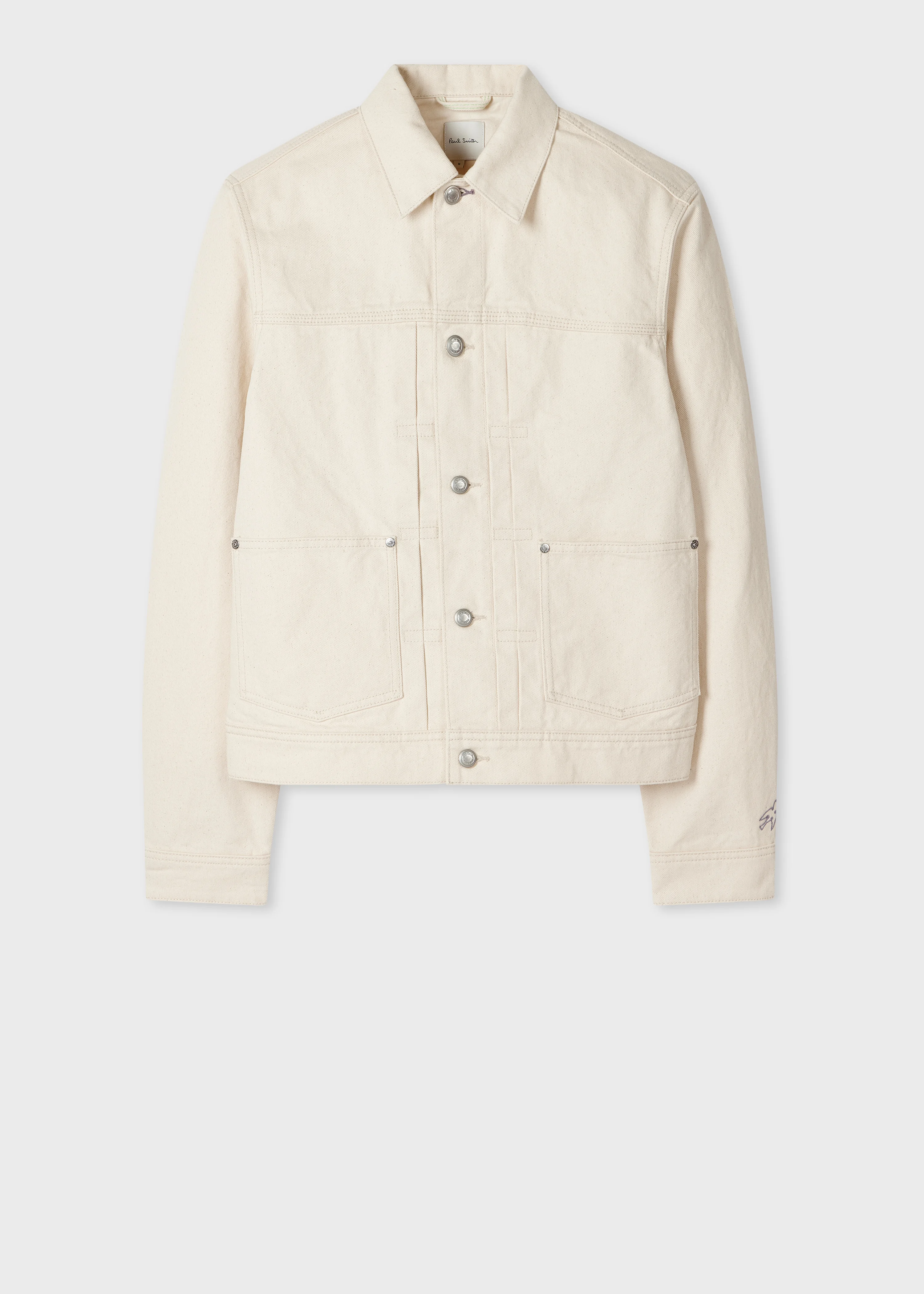 Made from a 100% cotton ecru denim, this jacket features a vintage-inspired design with pleated front, two patch pockets and a buckle back detail. Complete with Paul Smith embossed buttons and rivets, this jacket is finished with internal green stitch detailing - for a signature twist. The Fit - Regular-Fit Product Code: M1R-945Z-V03050-R