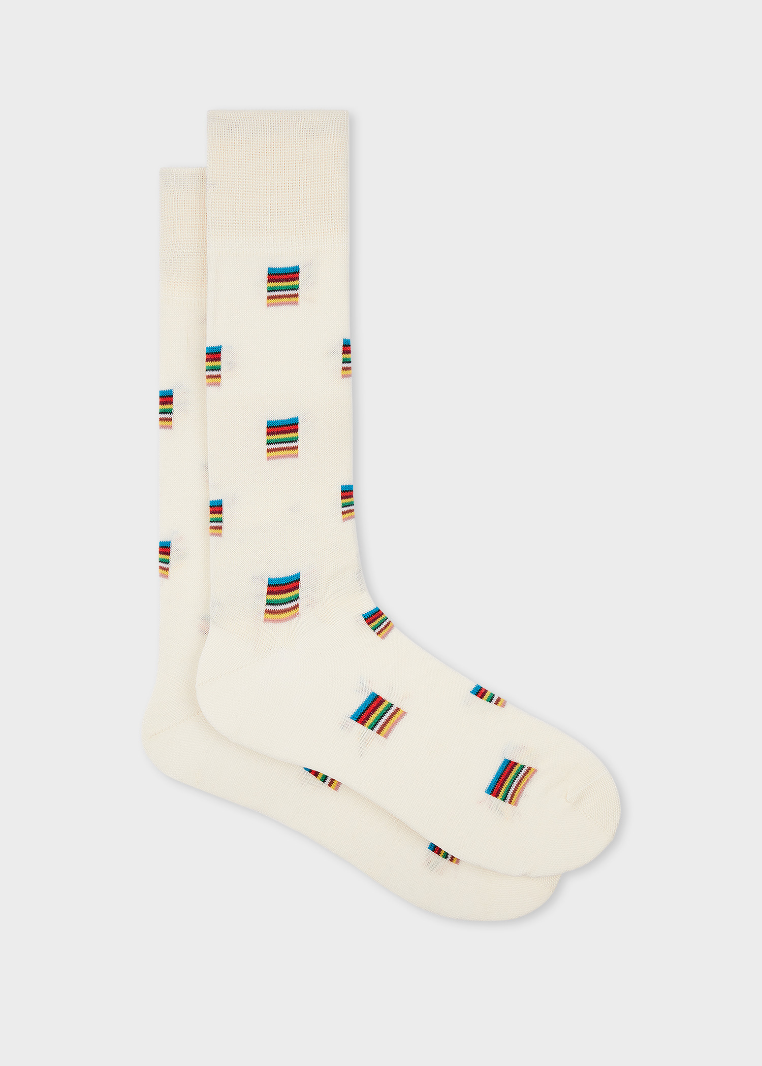 Made in Italy these ecru socks are made from a soft cotton blend and feature a square 'Signature Stripe' repeat pattern. 87% Cotton, 12% Polyamide, 1% Elastane Machine wash, wash inside out Made in Italy Product Code: M1A-380CI-P464-02