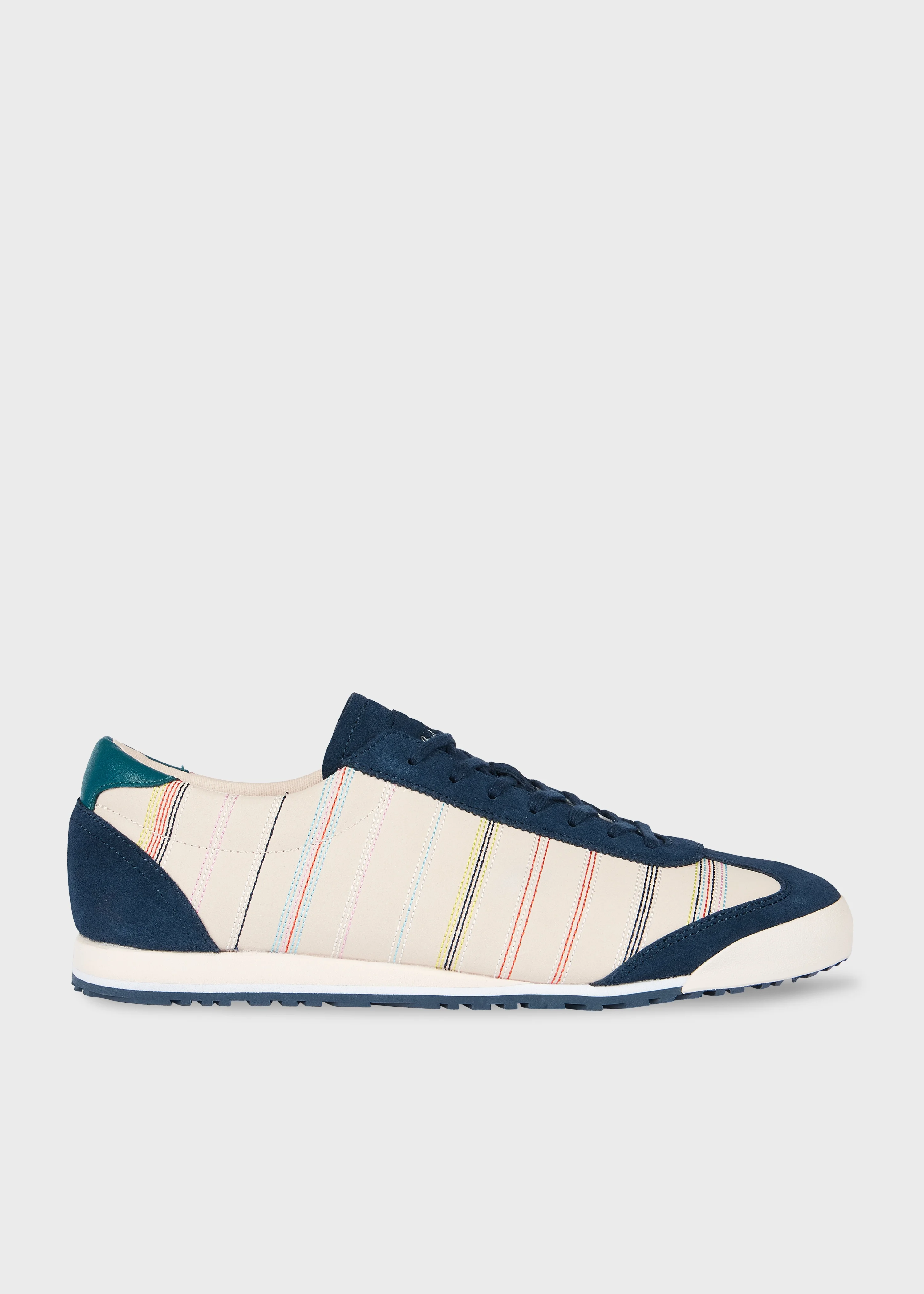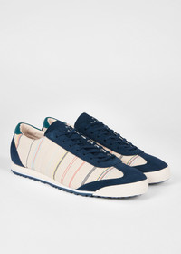Crafted from premium leather, these navy and ecru ‘Mestre’ trainers feature a vintage running style. Complete with colourful embroidered stripe detailing, textile lining combined with a two-colour EVA midsole, rubber toe bumper and branded rubber outsole. Product Code: M2S-MTE12-TLEA-49