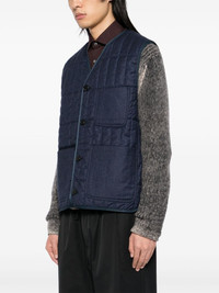 flannel quilted gilet Highlights - Blue - Wool-cashmere blend - Quilted - Front button fastening - V-neck - Two front patch pockets - Sleeveless - Straight hem - Full lining Imported Composition Lining: Viscose 100% Outer: Wool 90%, Cashmere 10% SIZE & FIT Model measurements Height 6 ft 2 in(1.88 m) Bust/Chest 34.25 in(87 cm) Hips 34.64 in(88 cm) Waist 26.77 in(68 cm) FittingInformation Designed for a relaxed fit, this piece allows for comfort and movement when worn The tie fastening gives an adaptable and personalised fit Made from a quilted non-stretch fabric, giving it no natural elasticity