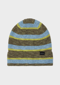 Made in Scotland from a linen and cotton-blend, this knitted beanie features a green, blue and yellow marl stripe pattern. Complete with a folded brim and Paul Smith signature tab label stitched. Product Code: M1A-383MK-U921-68