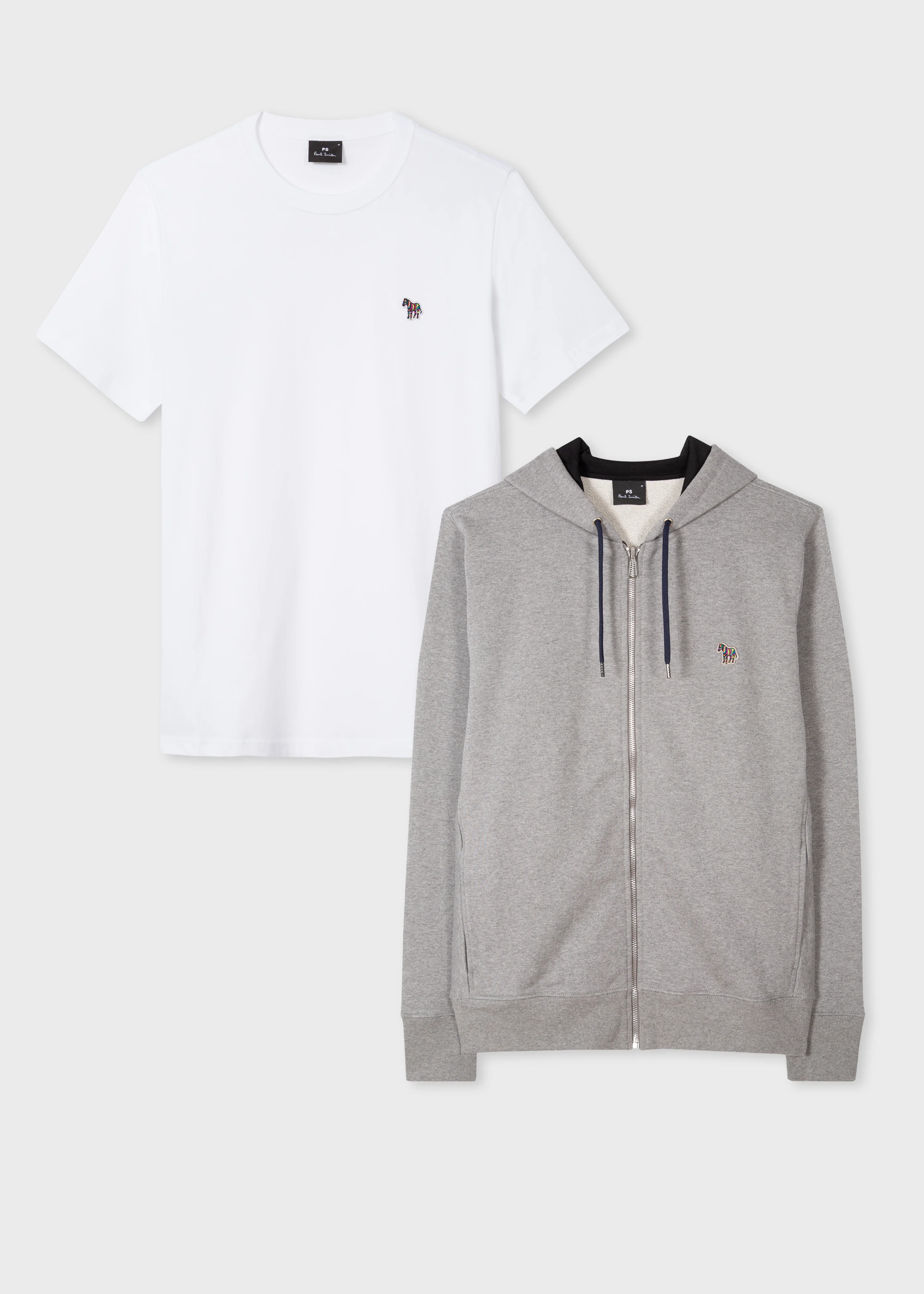 Specially curated gift sets presented in a Paul Smith box and gift wrap, making it easier to treat yourself or a loved one. This loungewear gift set includes: - Grey Cotton Zip-Front Zebra Logo Hoodie - White Cotton Zebra Logo T-Shirt Product Code: M2R-ECOMM-KZEBRA2
