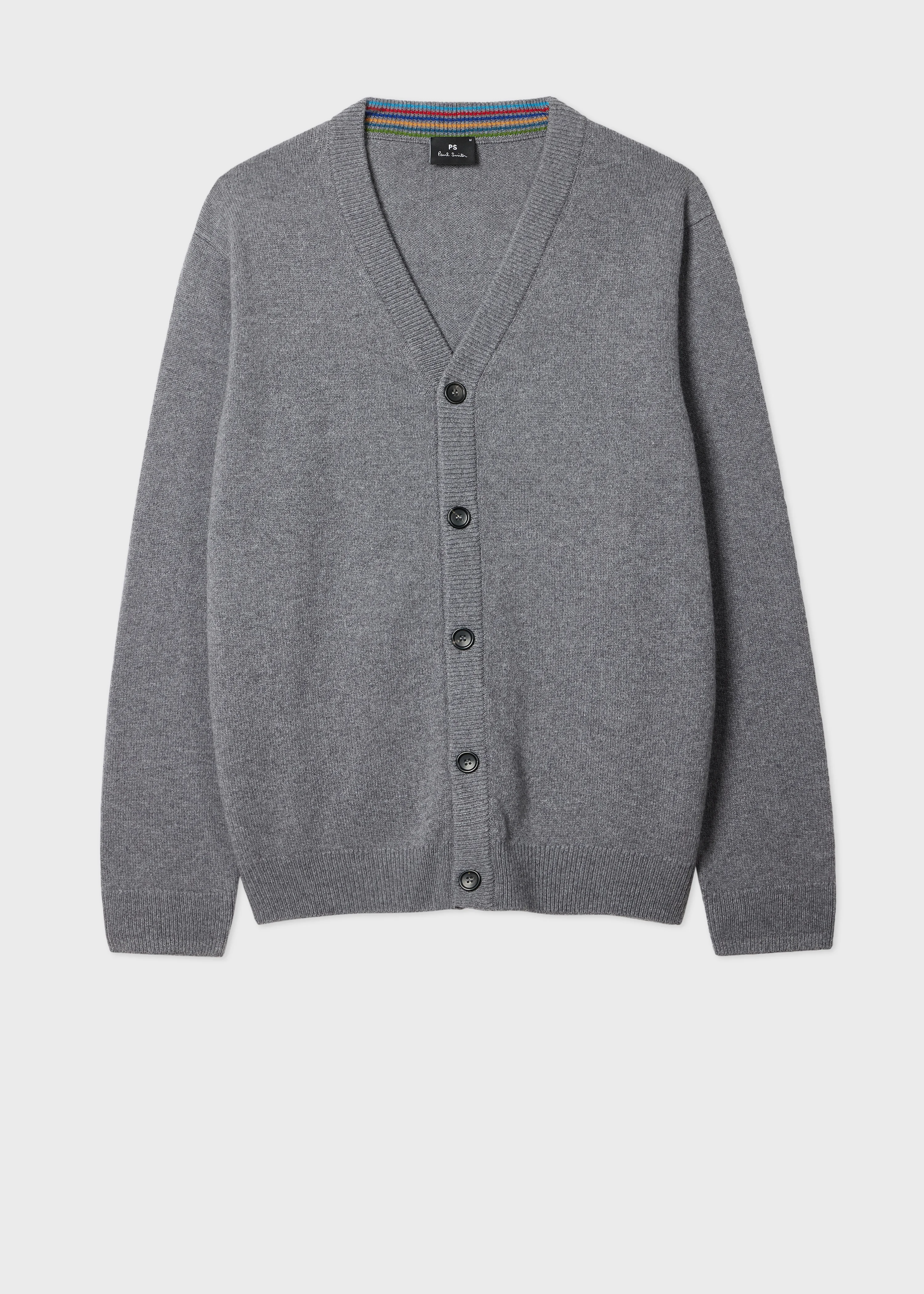 Made in Portugal from 100% merino wool, this grey cardigan features a classic V-neck design with five button placket. Cut for a regular-fit, this cardigan is finished with a 'Sports Stripe' collar trim - for a signature flash of colour. The Fit - Regular-Fit Product Code: M2R-488Z-T22514-72