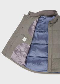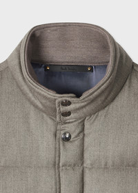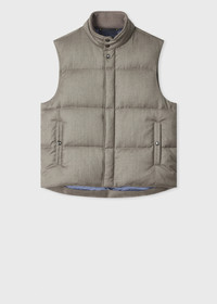 Made from a premium wool and cashmere-blend flannel cloth, this grey gilet is filled with duck down for added insulation. Complete with a zip fastening and press-stud storm flap, this gilet is finished with a full lining for comfort and press-stud fastening pockets for practicality. The Fit - Regular-Fit Product Code: M1R-710Z-T00109-73A