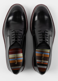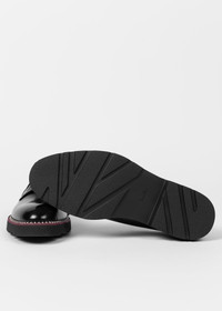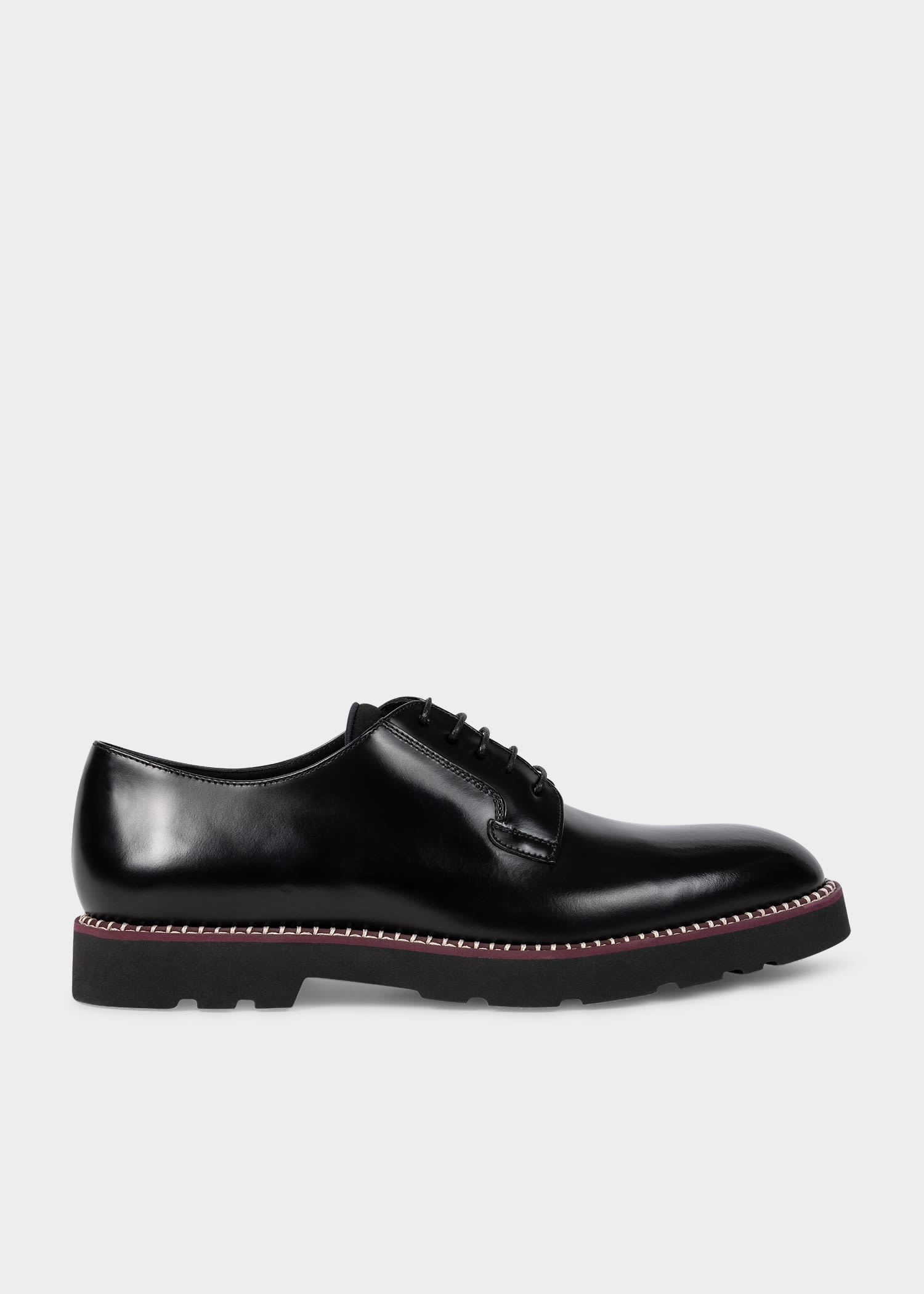 Made in Italy from premium leather uppers with a high-shine finish, these black 'Ras' shoes feature a classic Derby shape. Complete with contrast damson welt detail, these shoes are finished with rubber soles with 'Union Jack' pattern tread. 100% Leather Uppers 100% Rubber Soles Made in Italy Product Code: M1S-RAS20-MHSH-79
