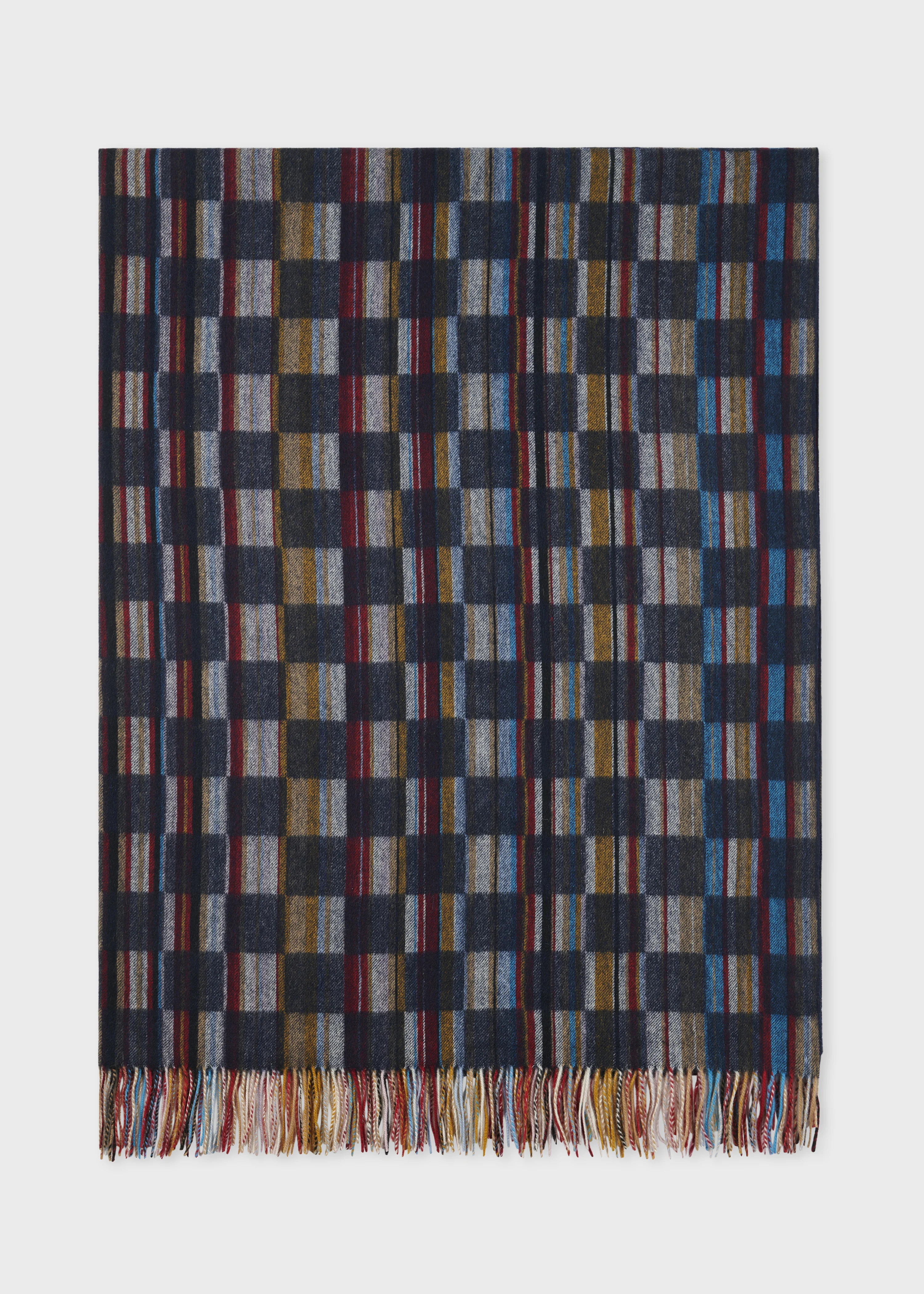 This luxurious blanket is made from a rich Lambswool composition. Featuring an iconic 'Signature Stripe' design decorated in a reimagined check woven pattern, which is slightly different on each side, this blanket is finished with short tasselled ends. Product Code: M1A-153K-T821-92
