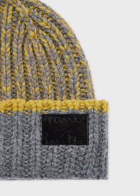 Made in Britain, this beanie hat and scarf set features a chunky rib knit texture throughout, in shades of grey and yellow. Crafted from soft lambswool for a soft feel. Product Code: M1A-ECOMM-TGIFT-76