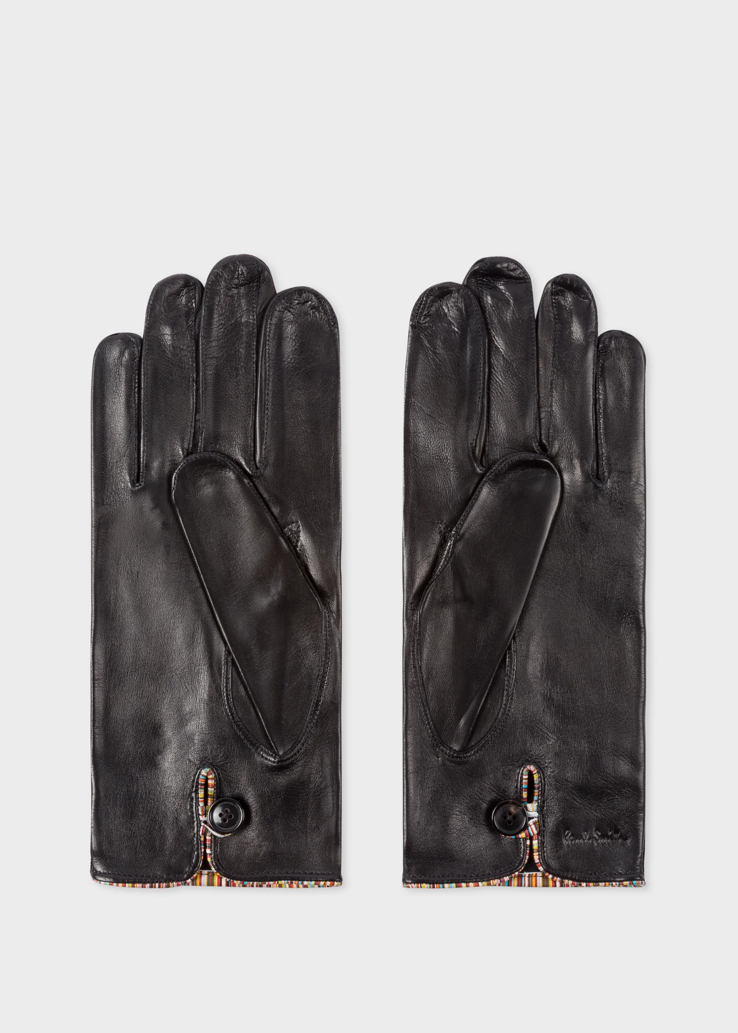 Men’s black 100% lambskin leather unlined gloves. Made in Italy, these gloves are finished with subtle 'Signature Stripe' piping, tonal stitching and an embossed Paul Smith signature. A classic and timeless leather glove, pair with macs and epsom coats for a refined look on chilly days. 100% Lambskin Dry clean only Made in Italy Product Code: M1A-028D-AG21-79