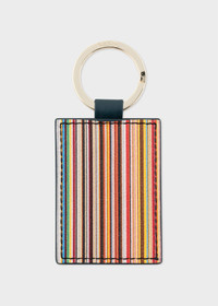 Crafted in Italy from premium leather, this keyring features our classic 'Signature Stripe' all-over and is complete with silver hardware. Finished with a gold foil Paul Smith signature on the back, this keyring is the perfect gift for someone special. Size: 6 x 4.5 cm 50% Calf Leather, 50% Lamb Leather Made in Italy Please note all Monogrammed items are non-returnable. Product Code: M1A-4780-BMULTI-45-0