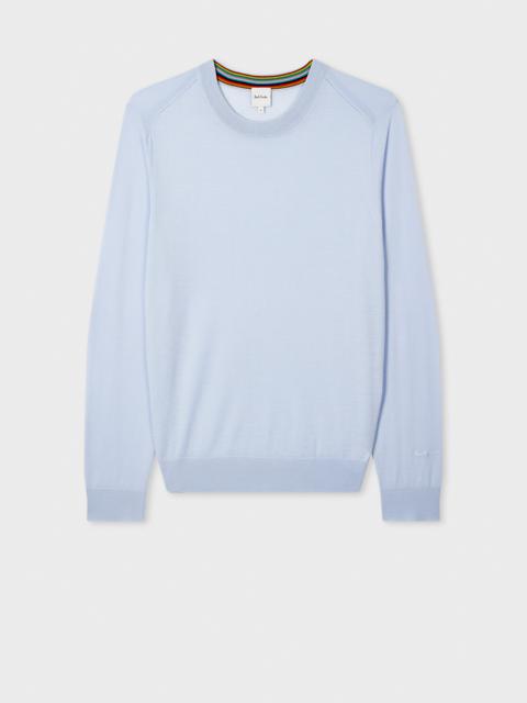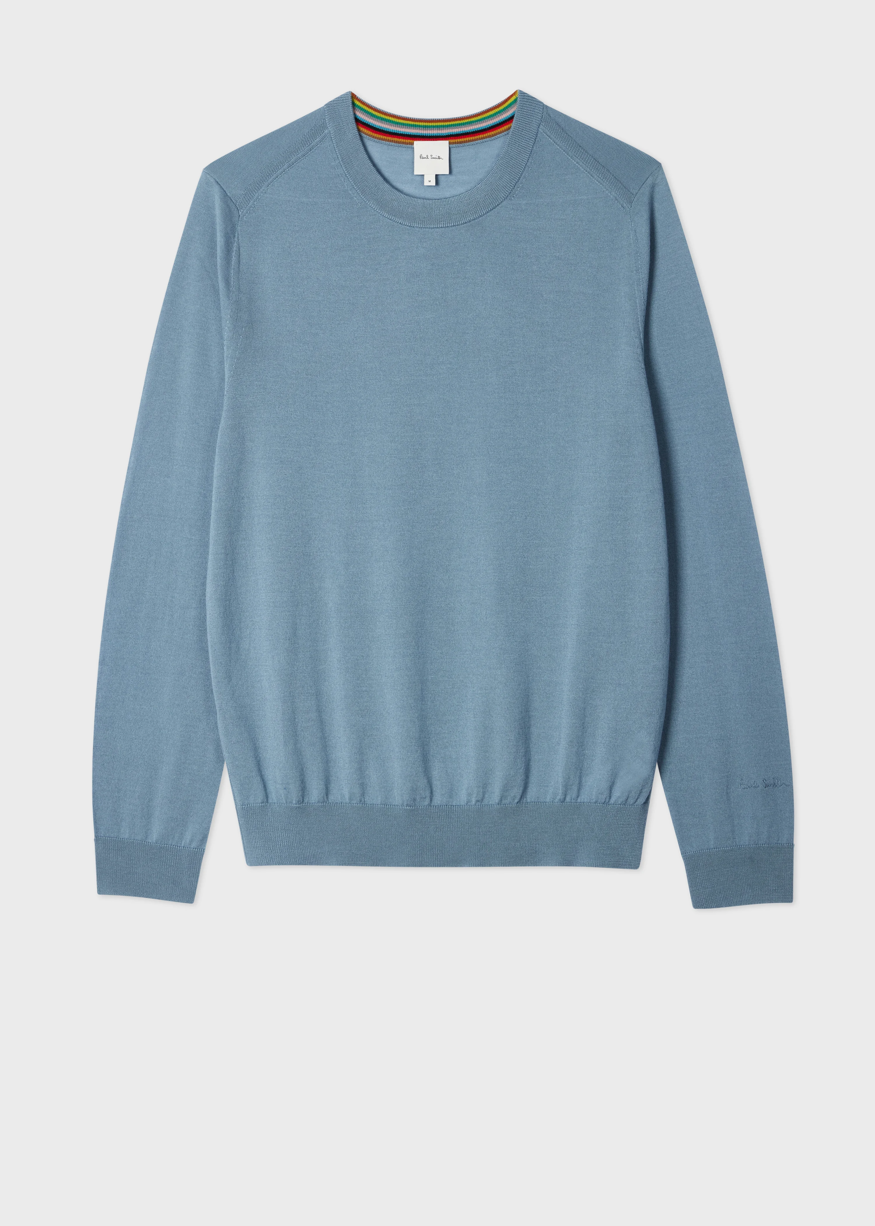 Made from a lightweight and breathable Merino wool with a soft handle finish, this muted light blue crew neck sweater features our classic 'Signature Stripe' internally on the collar. Finished with tonal ribbed shoulder seams and a tonal signature logo embroidered on the cuff. The Fit - Regular-Fit Product Code: M1R-238Z-P02093-40A