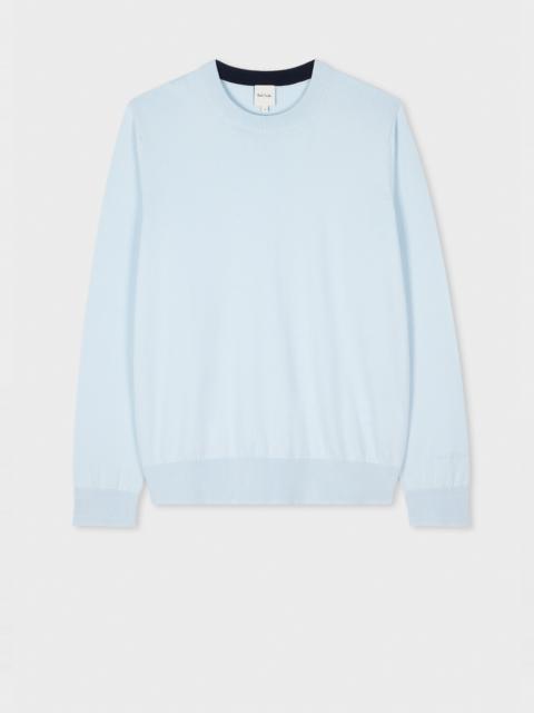 This light blue crew neck sweater, crafted from organic cotton, boasts a soft, lightweight knit. It features ribbed trim along the collar and hemline, with tonal stitching for a clean, understated look. Subtle branding adds a touch of refinement to the design. Perfect for layering or wearing solo, it's a versatile addition to any wardrobe. 100% Organic Cotton Hand wash only The Fit Regular-Fit is relaxed through the body. Product Code: M1R-626Y-P02676-40