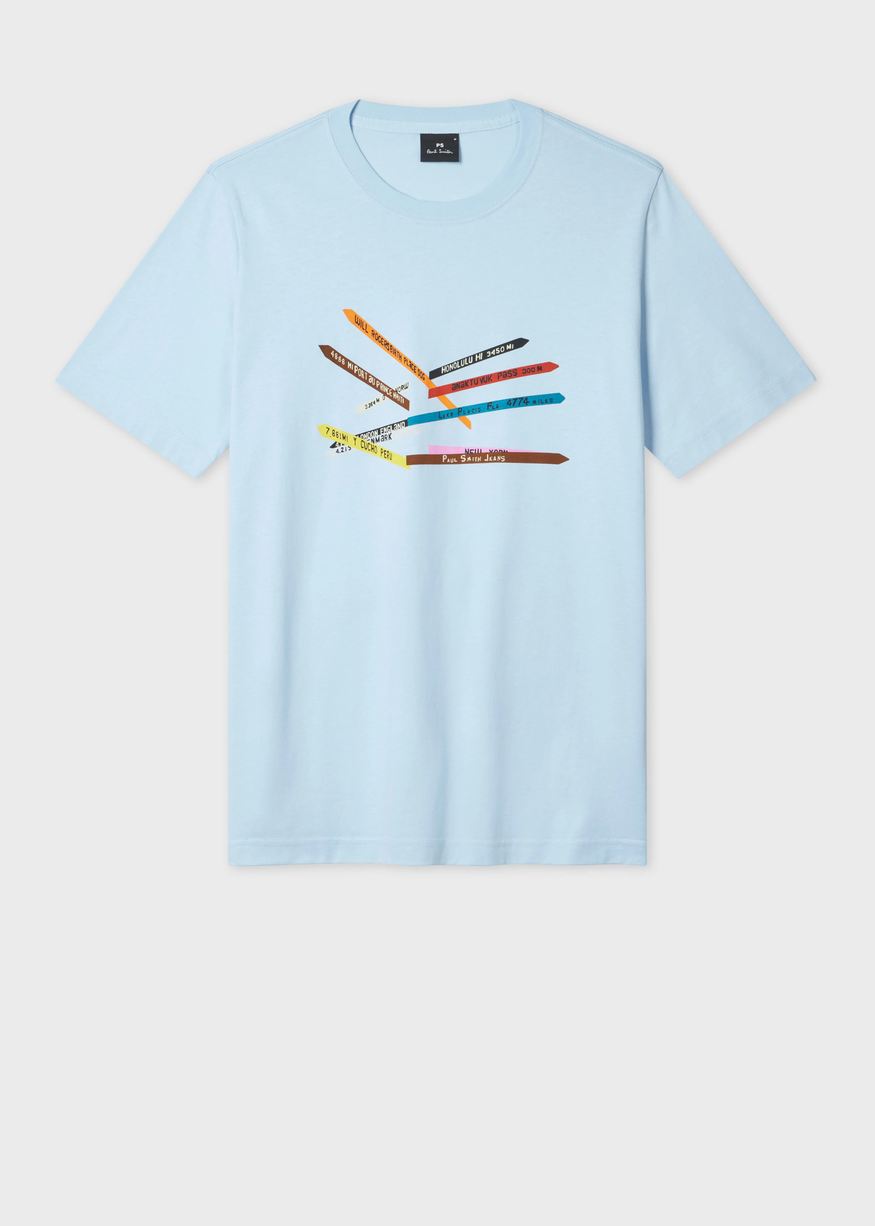 Made from organically grown cotton, this light blue crew neck T-shirt features a 'Sign Posts' print taken from the archives. Cut for a regular-fit, this T-shirt is finished with a ribbed collar. The Fit - Regular-Fit is relaxed through the body. Product Code: M2R-011R-TP7744-41E