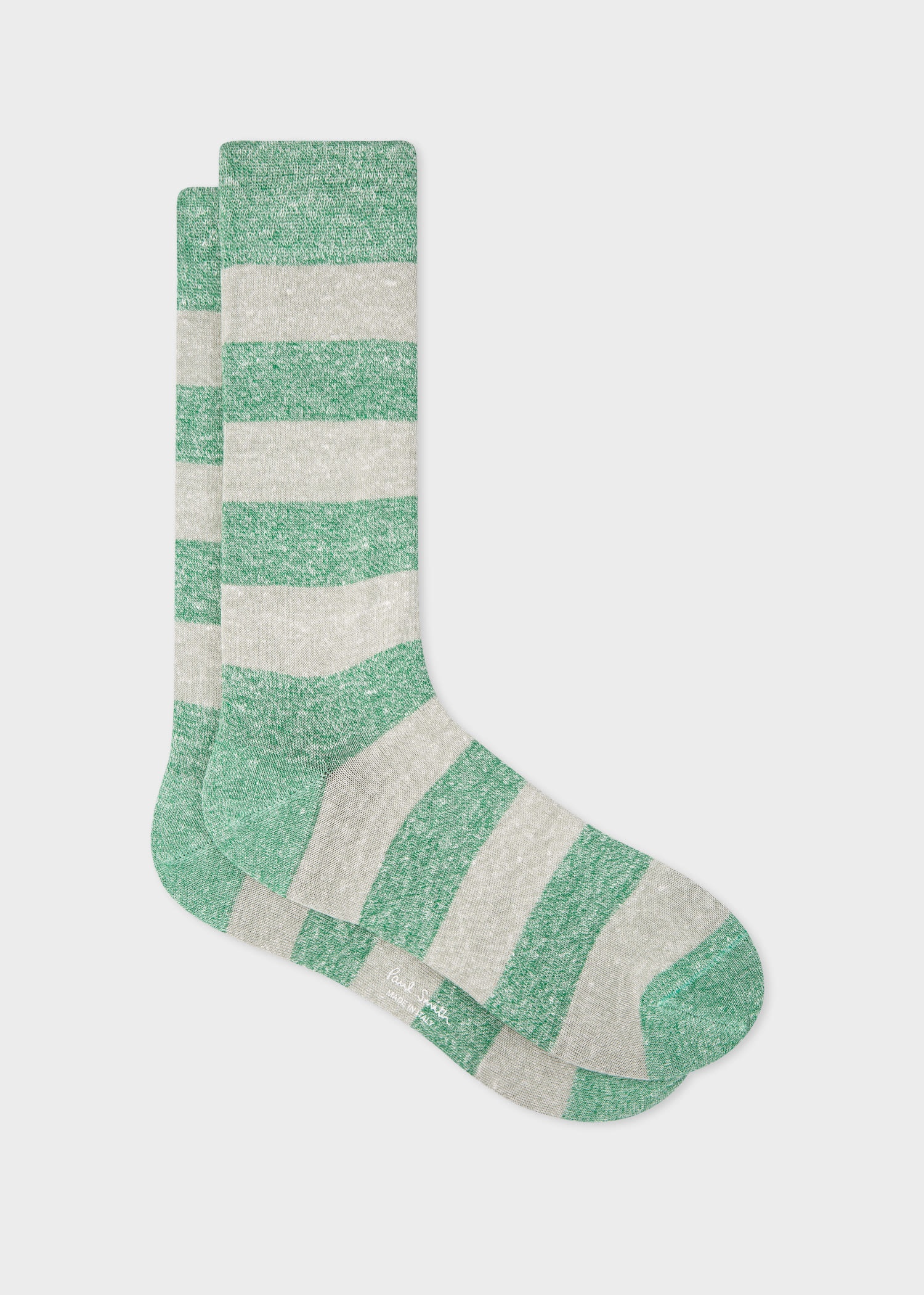 Made in Italy from a linen-blend, these soft socks feature a pale green stripe pattern throughout, injecting a subtle hint of colour into your sock drawer. Made in Italy 52% Linen, 30% Cotton, 18% Polyamide Machine Washable Product Code: M1A-800MO-K203-38-0