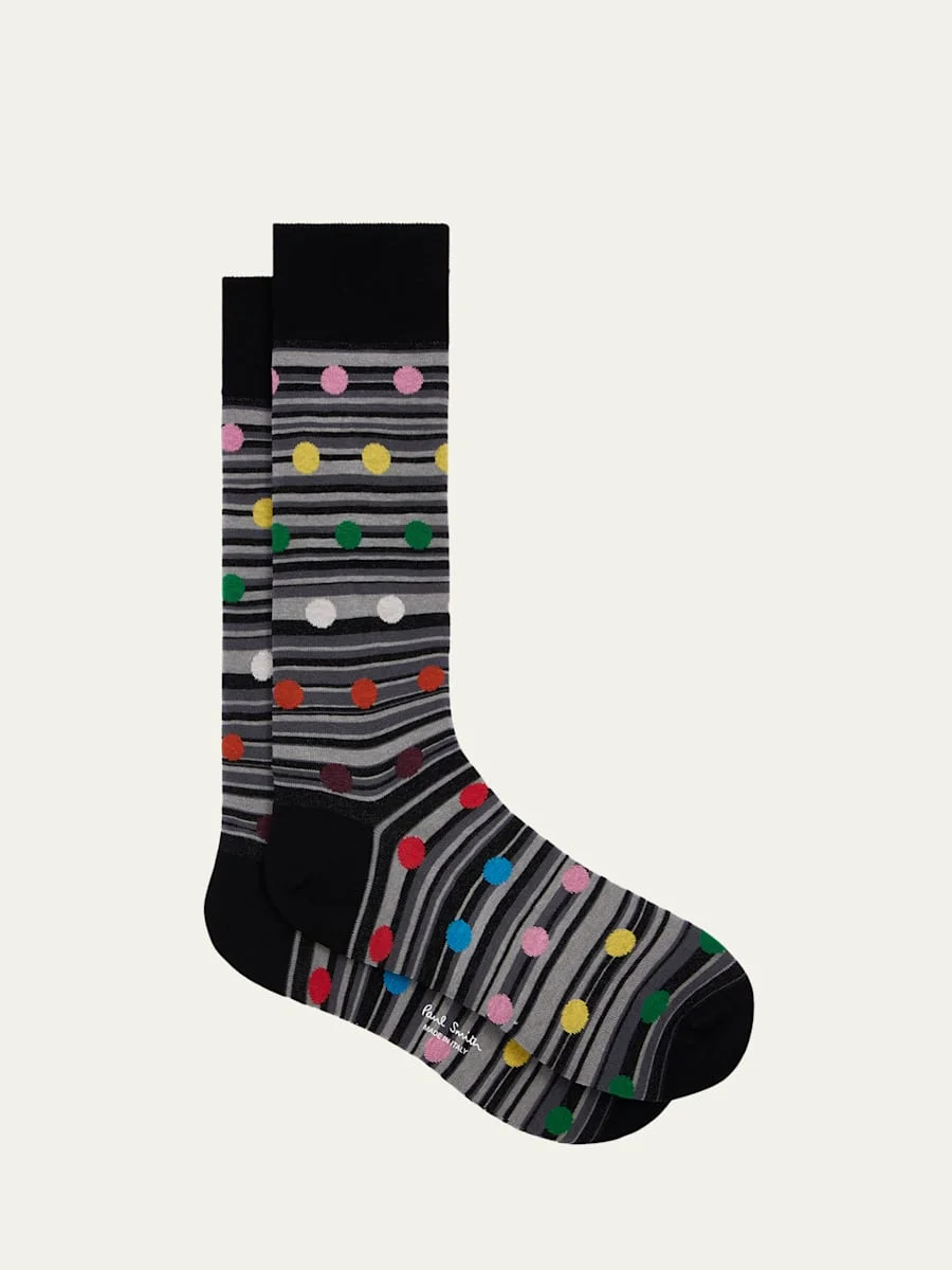 Paul Smith crew socks defined by a "Kinsley" multicolor polka dot design over the distincitve signature stripes Ribbed cuffs to prevent slipping Reinforced toe and heel Cotton/nylon/elastane Made in Italy