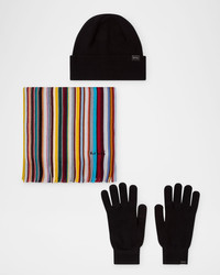 - Paul Smith three-piece gift set - Includes premium branded gift packaging - Wool - Imported - Beanie hat - Logo tab on the fold-over cuff - Scarf: - May be styled multiple ways - Logo signature on the end - Fringe ends - Gloves: - Ribbed wrists - Logo tab