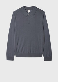 Steel Blue Merino Wool Knitted Long-Sleeve Polo Shirt