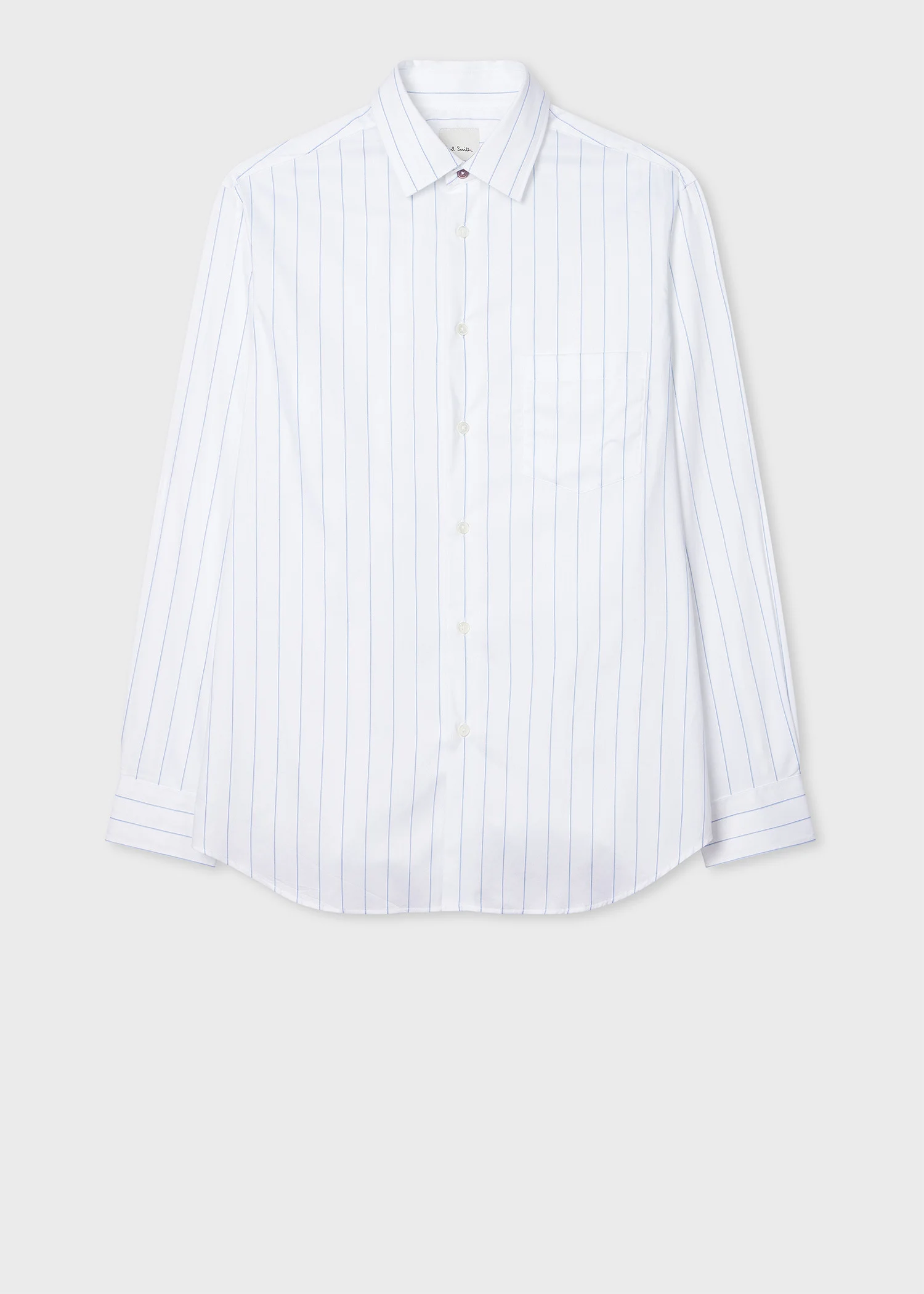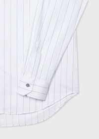 Crafted in Italy from soft 100% cotton with a subtle double fine stripe, this white long-sleeve shirt is cut for a more relaxed modern-fit. Complete with chest patch pocket and point collar with removable bones, this shirt is finished with contrasting purple buttons at the collar and cuffs. The Fit - Modern-Fit Product Code: M1R-889Z-R02874-02